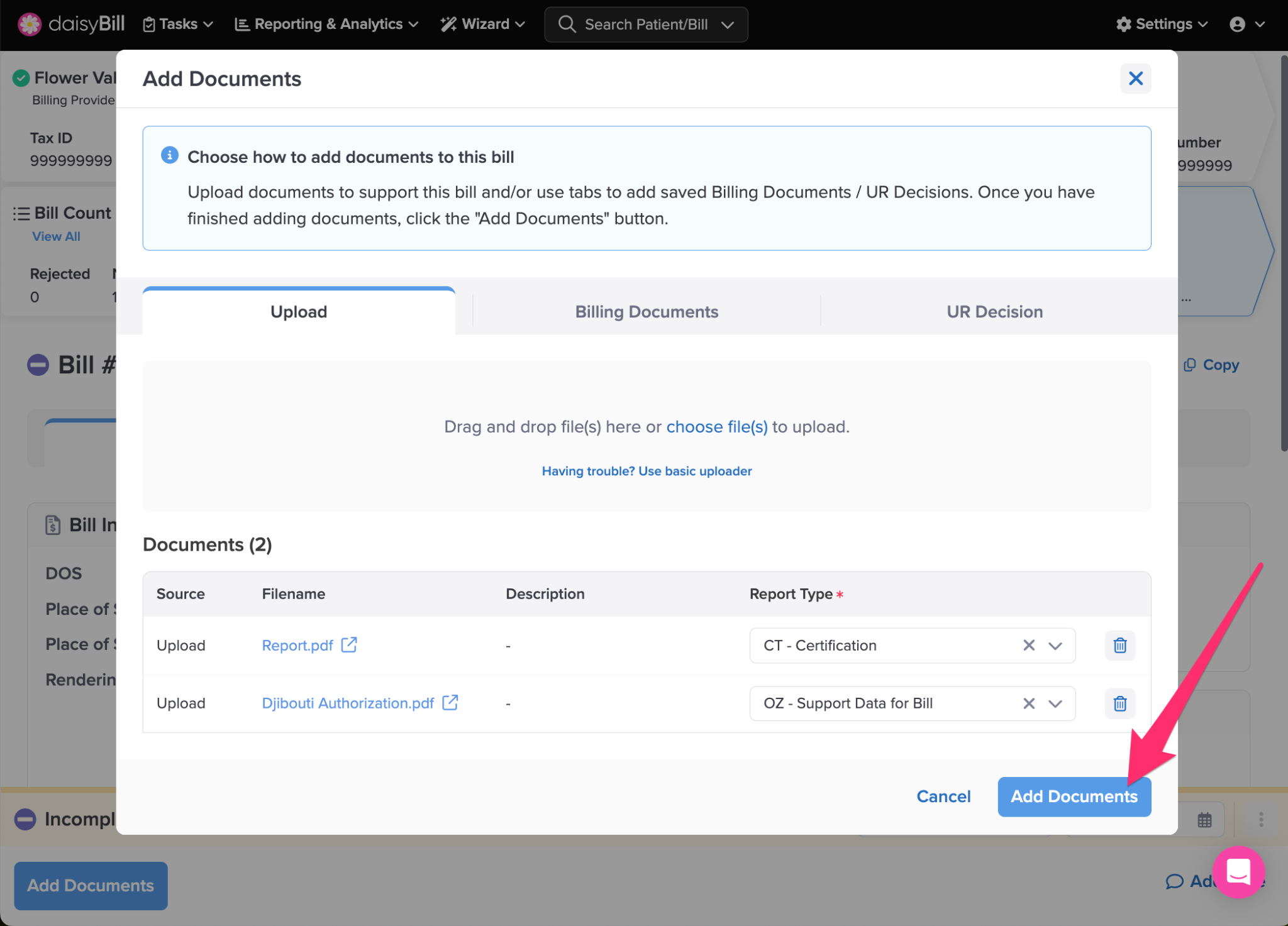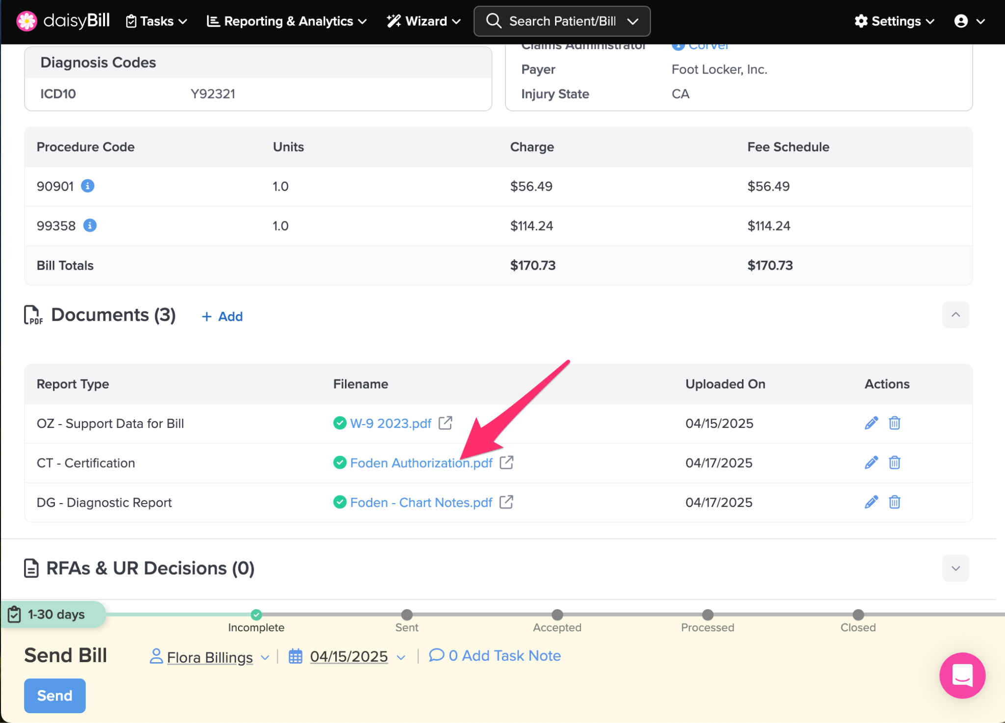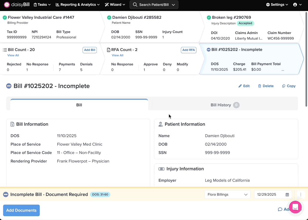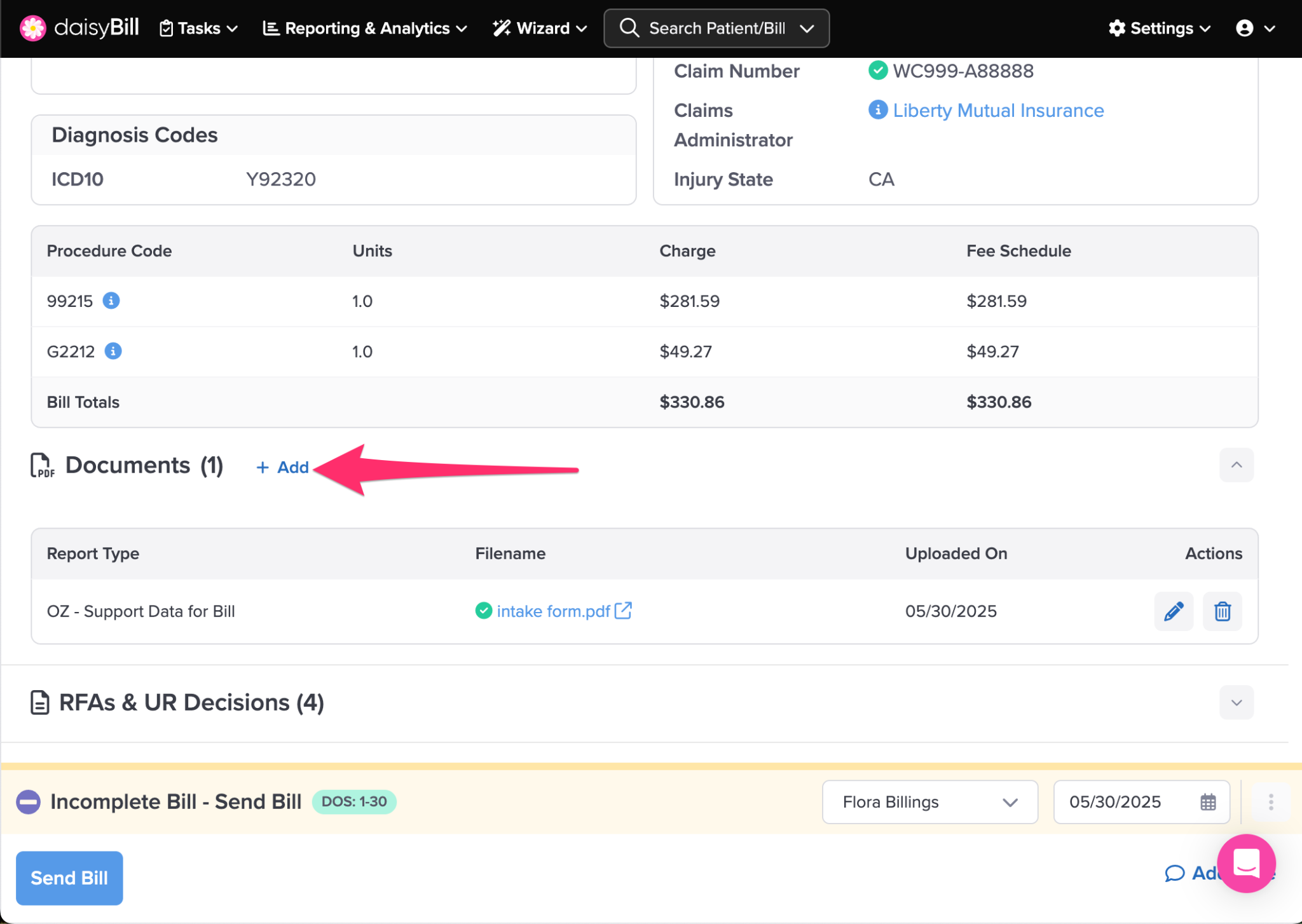 To add other document types, please see these Help Articles: Add from Document Library, Add Injury Documents to Bill, Add RFA Decision to Bill.