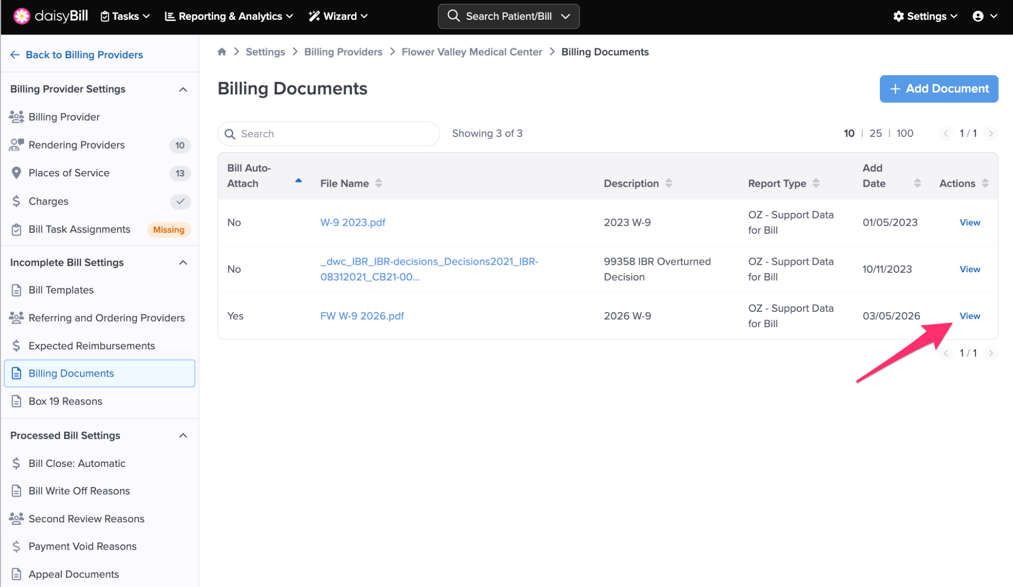 Billing Documents allows you to add and save important billing documents that are frequently required when sending bills for a Billing Provider, such as W-9 Forms, testing standards, and IBR Decisions.