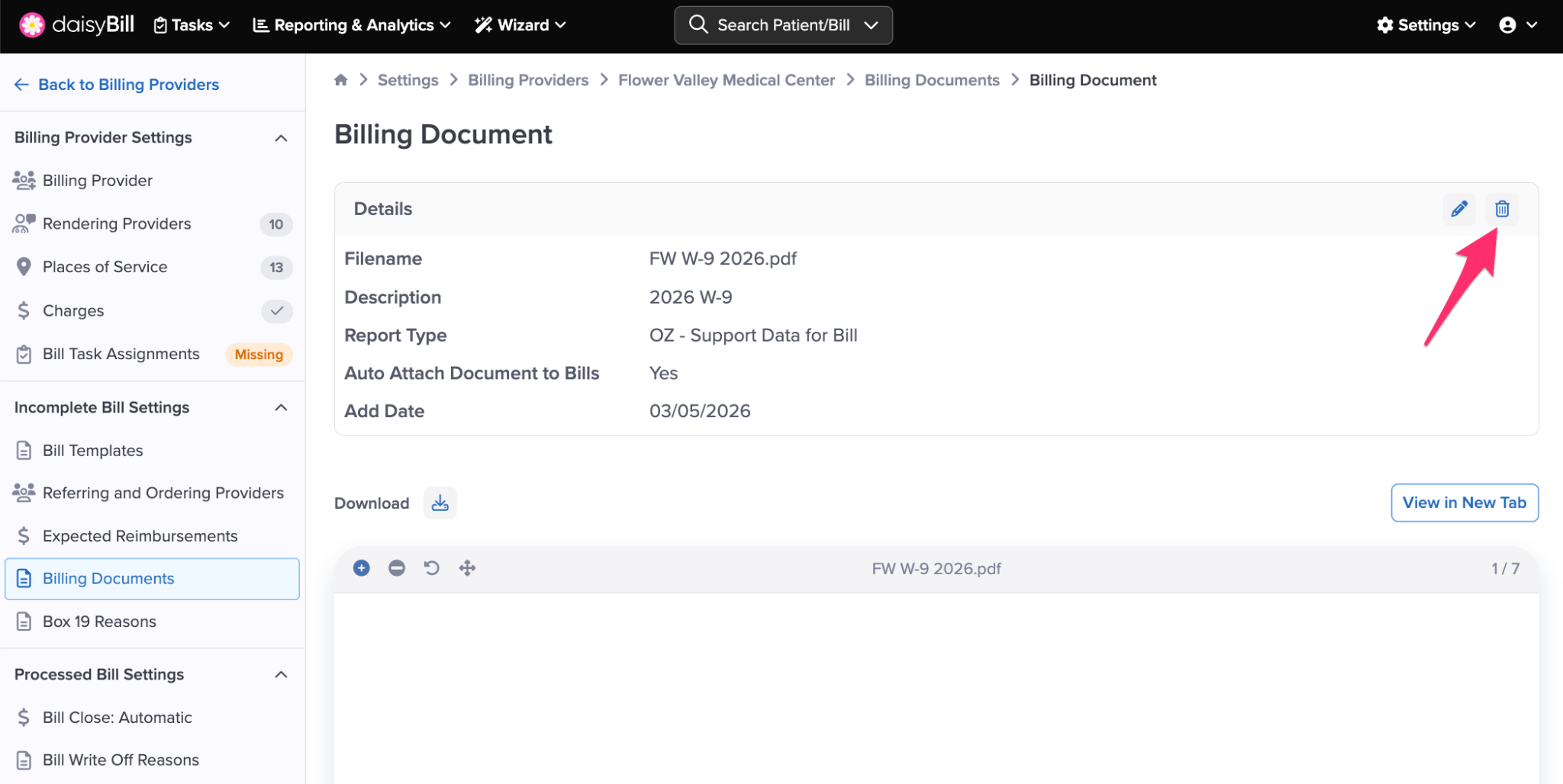 Step 11. (Situational) To delete a Billing Document, click the Trashcan icon