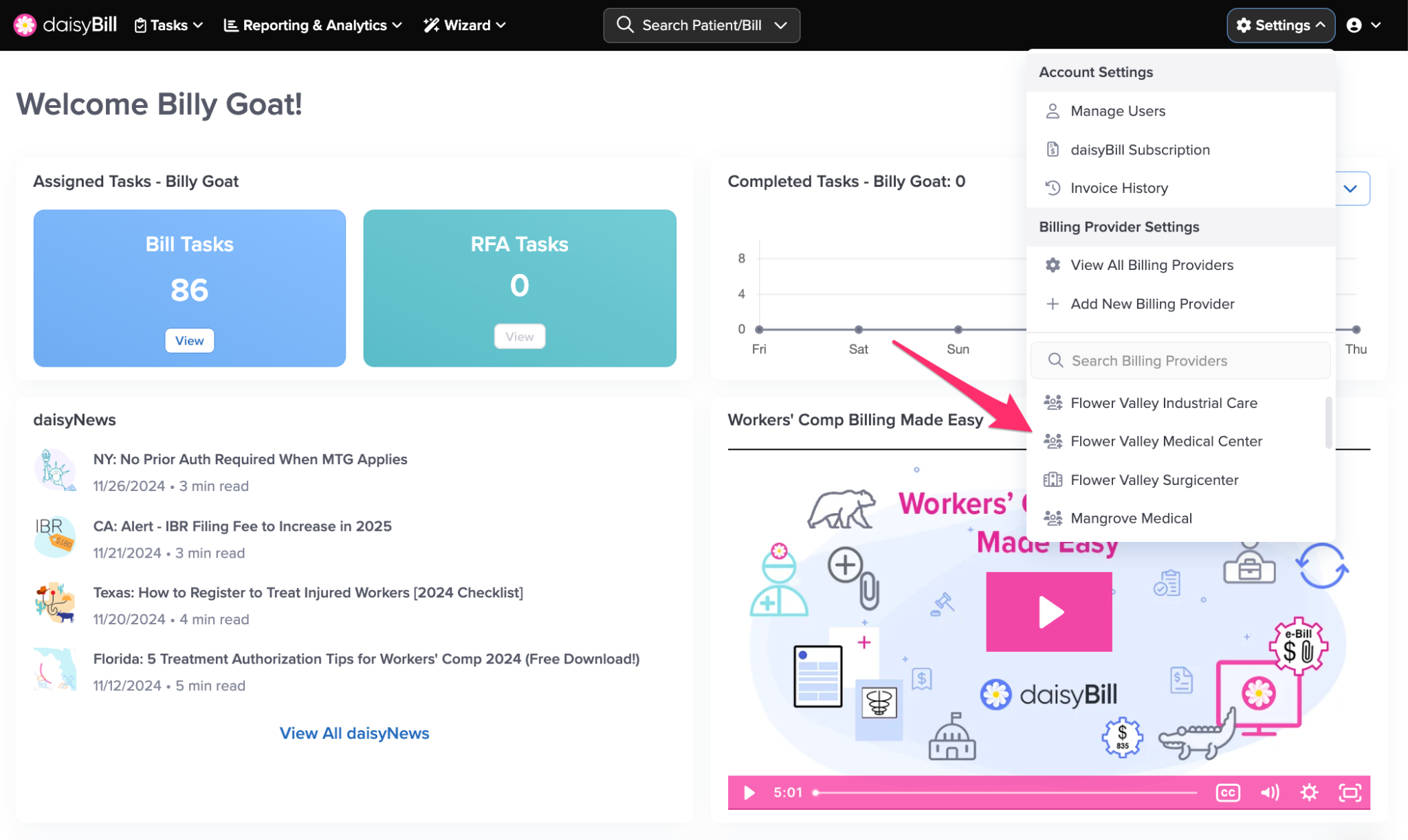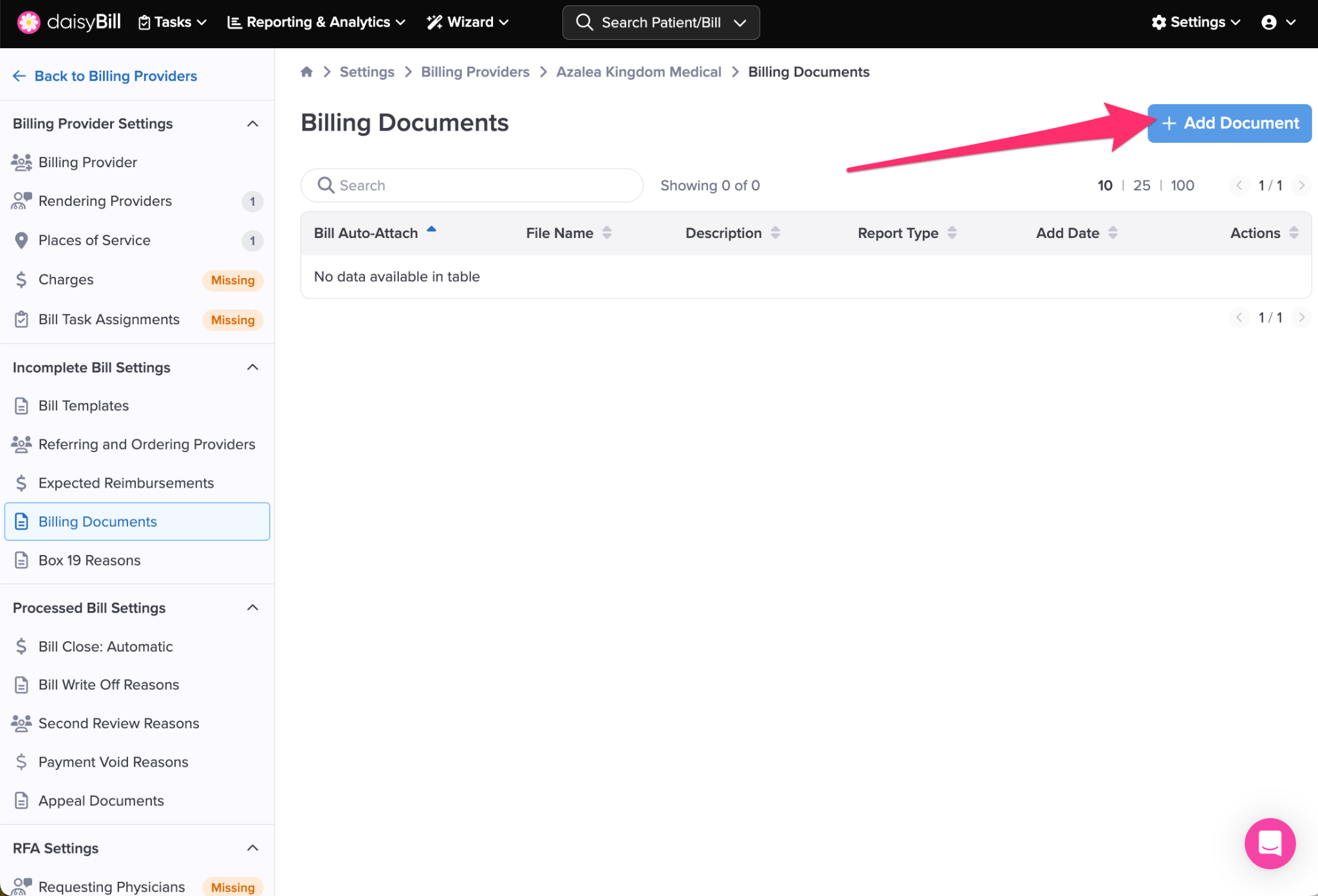 Step 1. On the navigation bar, click ‘Settings’, then click the name of the Billing Provider
