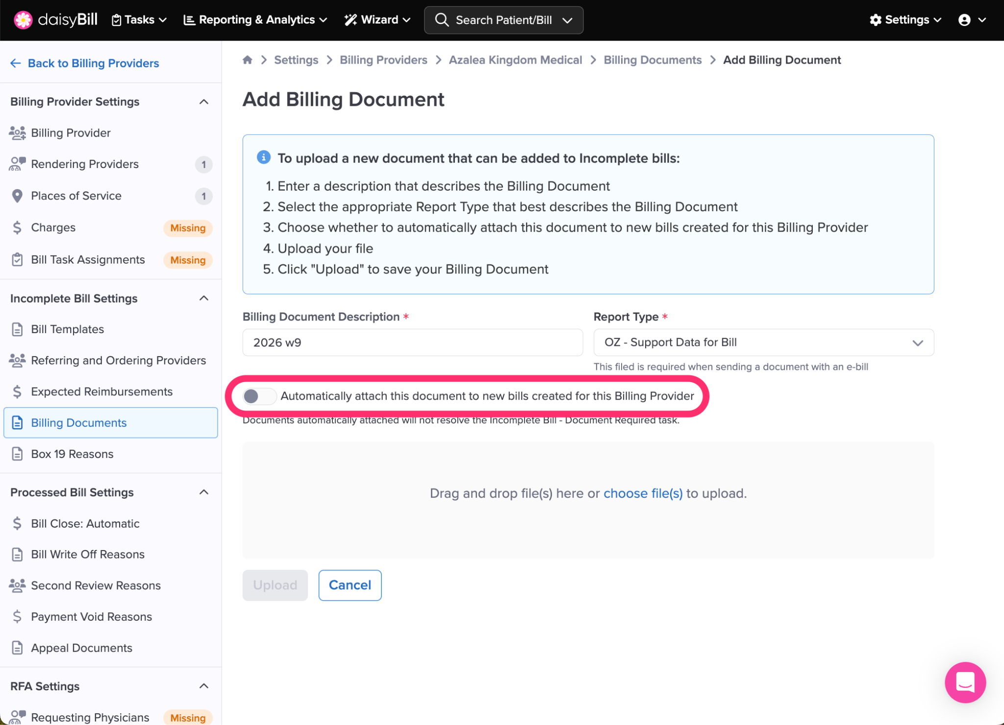 If you wish to automatically attach this document to all new Bills, toggle the corresponding button.