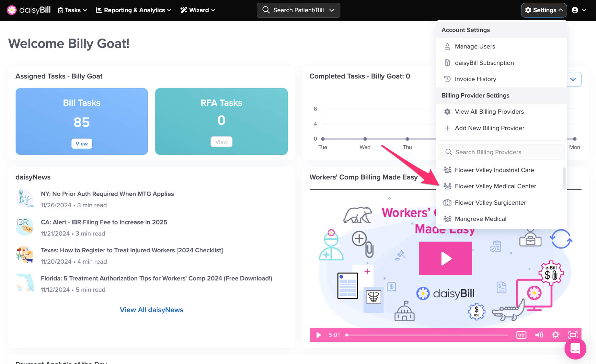 Step 1. On the navigation bar, click ‘Settings’, then click the name of the Billing Provider