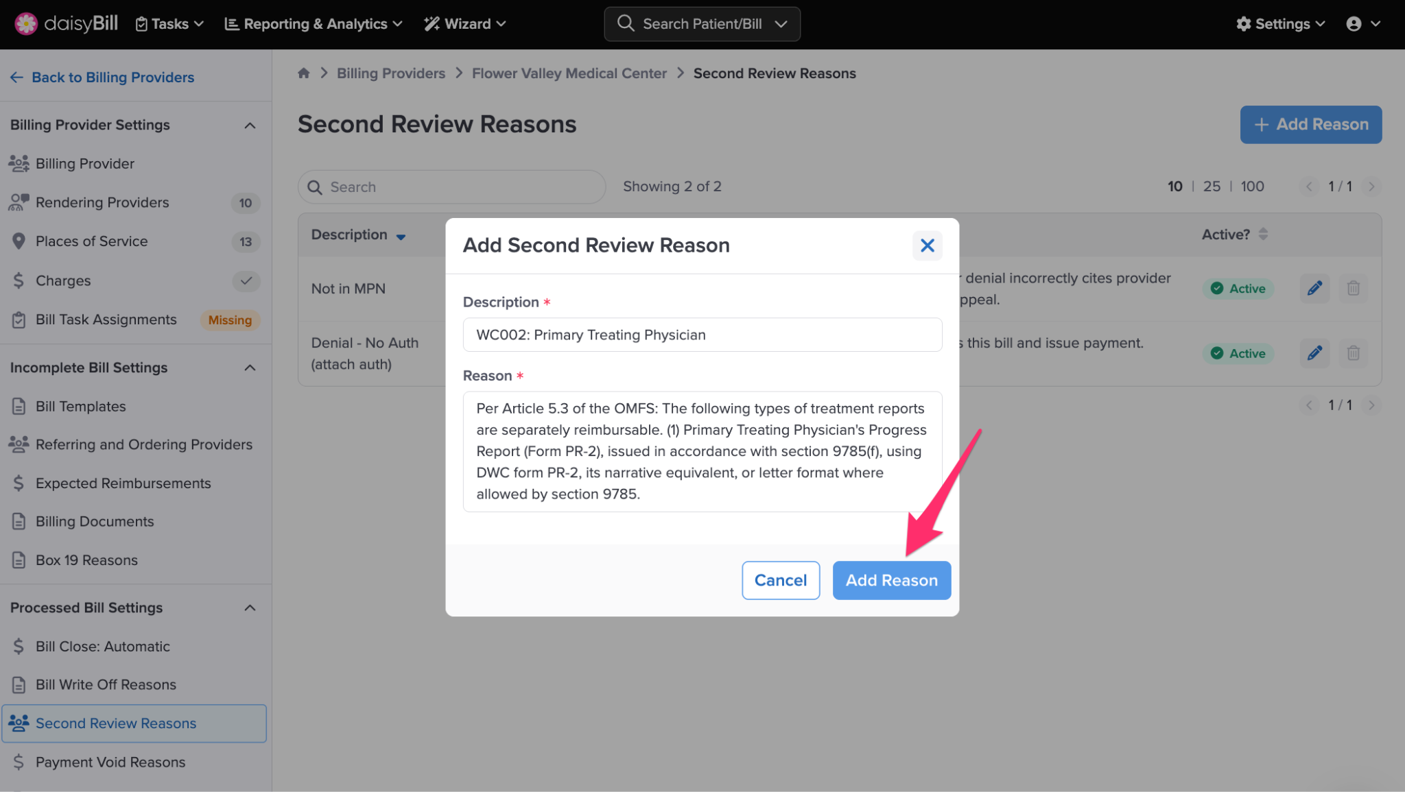 Only daisyBill Users with an Administrator role can manage Second Review / Appeal Reasons. For accounts with multiple Billing Providers, daisyBill maintains separate Second Review / Appeal Reasons for each Billing Provider.