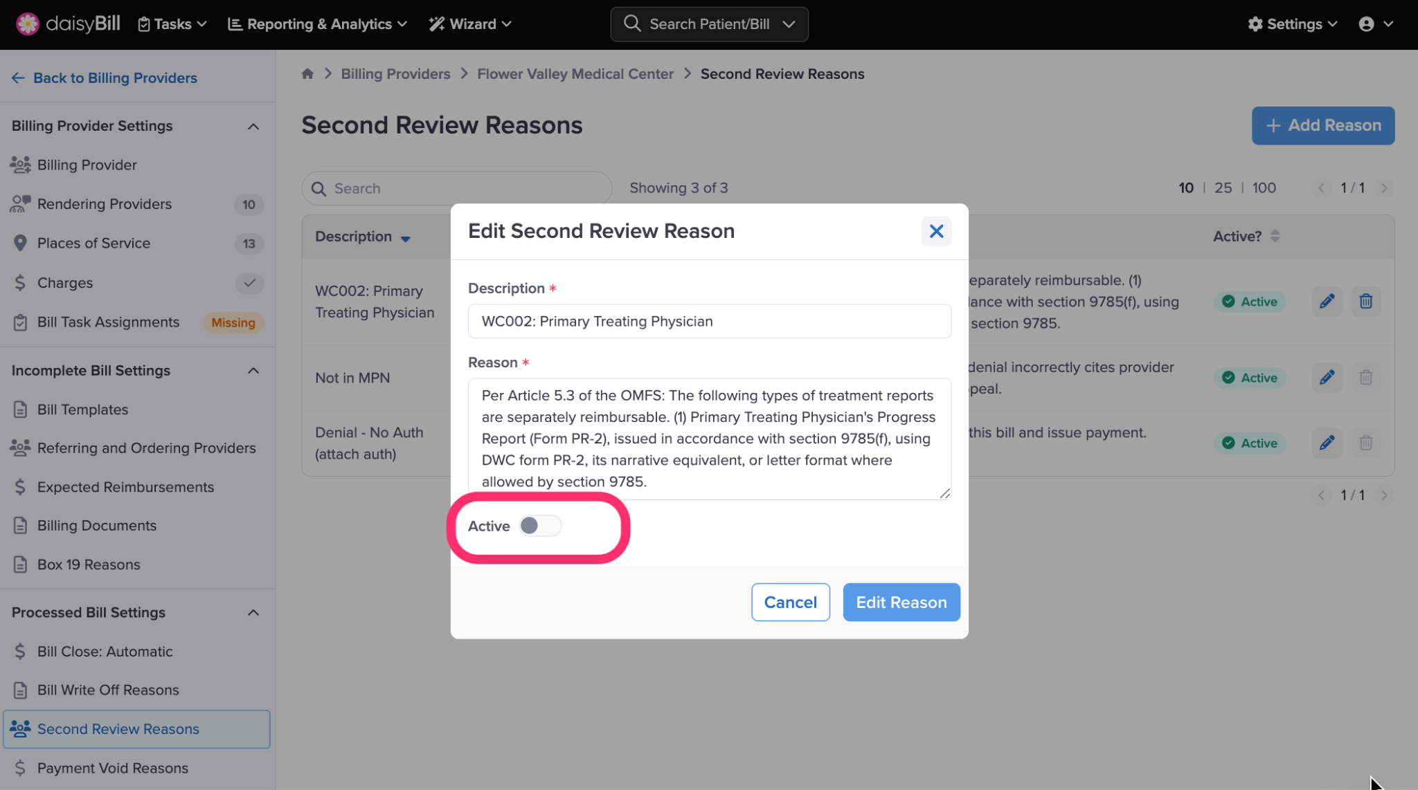 New Second Review / Appeal Reasons are automatically set as Active. To deactivate a Second Review / Appeal Reason, toggle the ‘Active’ button off.