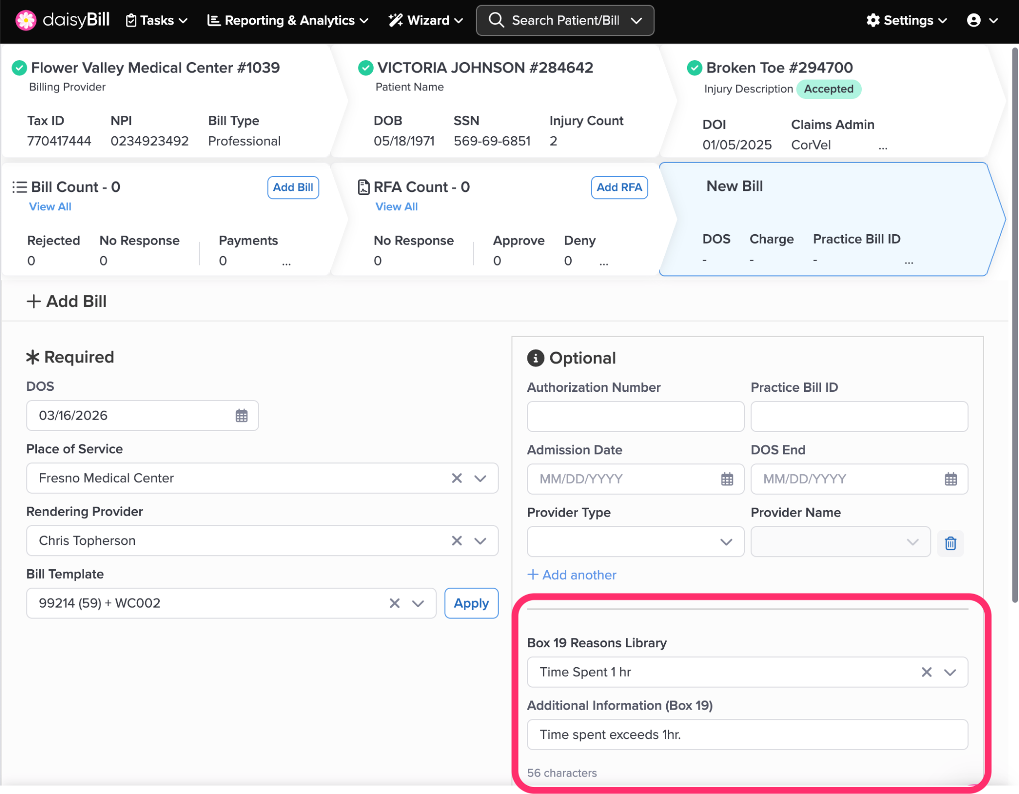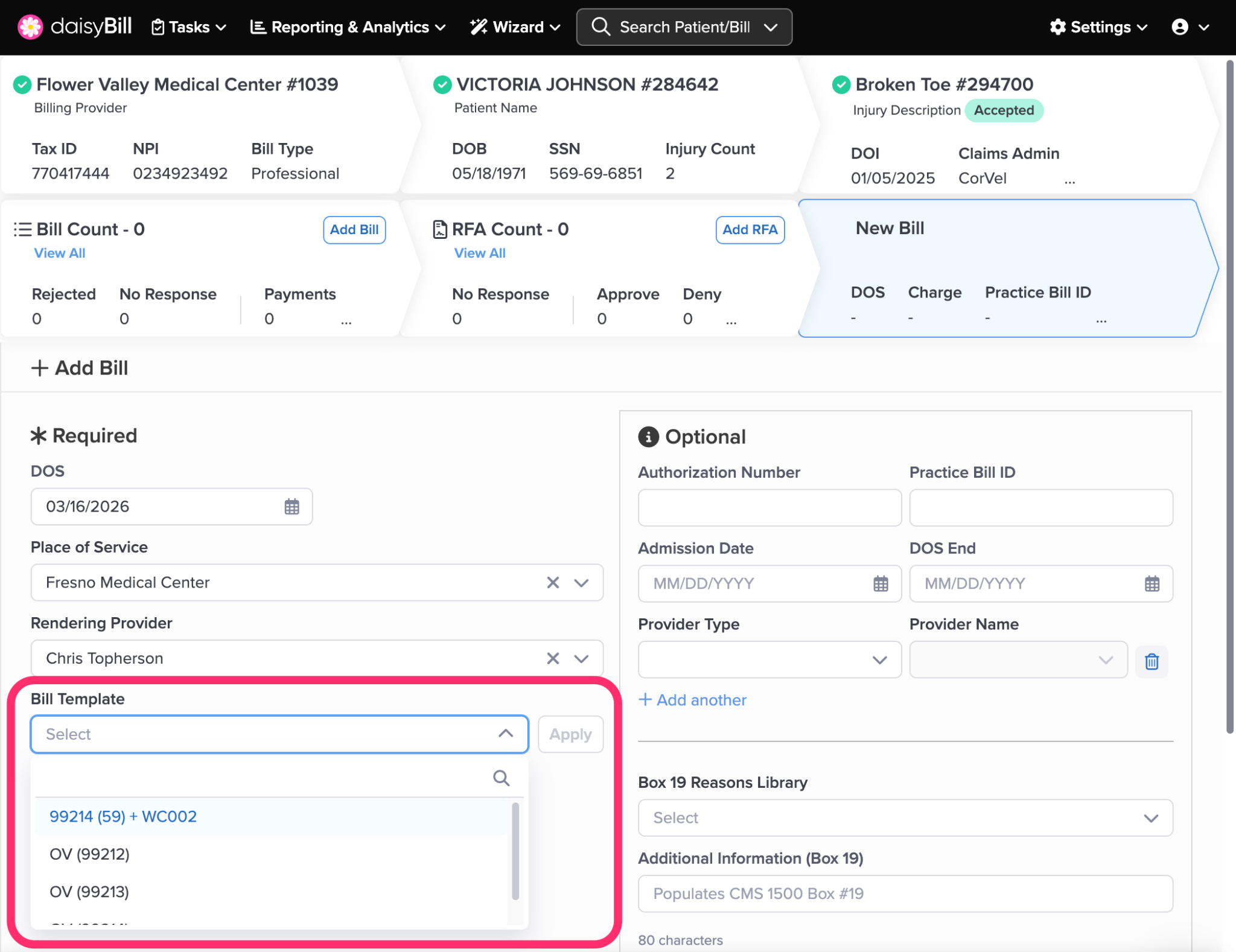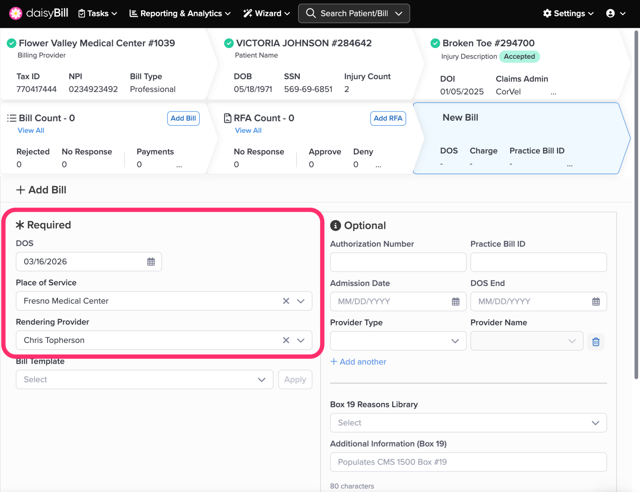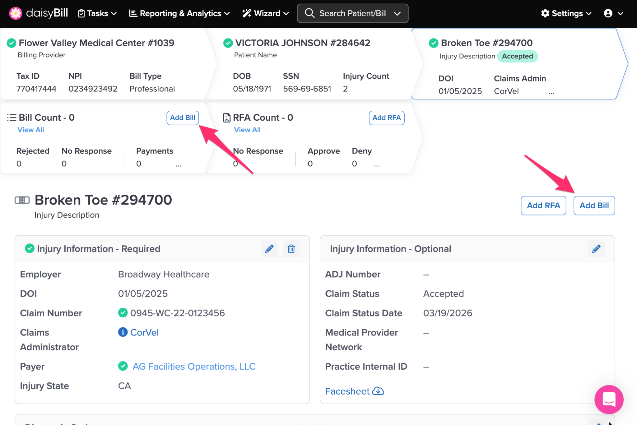 daisyBill organizes every Bill you create under its associated Injury. Follow the steps below to add a new Bill to an Injury.