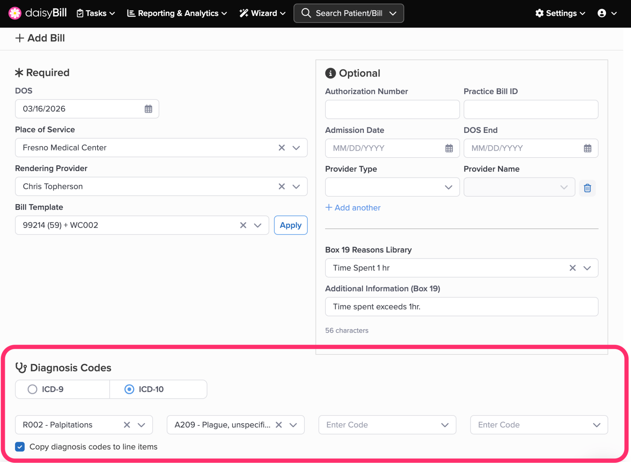 • If entering a Bill for DOS prior to 10/01/2015, switch Diagnosis Codes to ICD-9. (All dates of service on or after 10/1/2015 require ICD-10 Diagnosis Codes.)