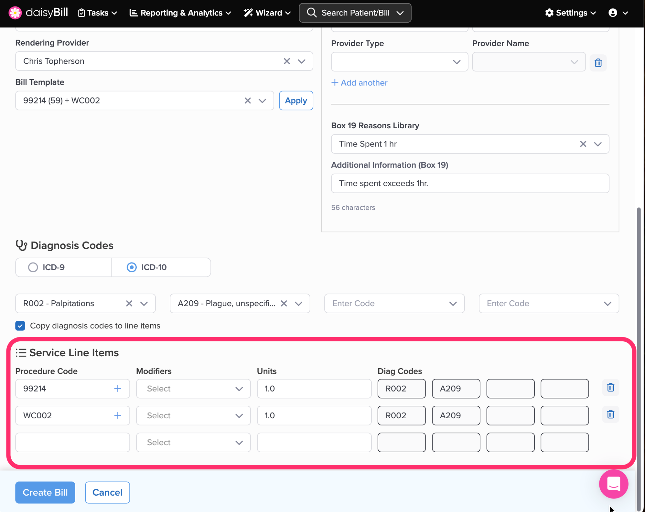 • Diagnosis Codes entered on the patient’s Injury page automatically appear on the Bill. For help on adding Diagnosis Codes to the Injury page, see this Help Article: Edit Injury.