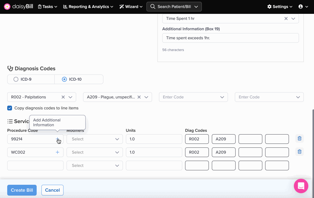 Click the + icon next to the Procedure Code to enter Additional Information, such as a description or note about the Code or service. This information populates boxes 24a-d, also known as the ‘Grey’ space, on the CMS1500. The maximum number of characters allowed is 50.