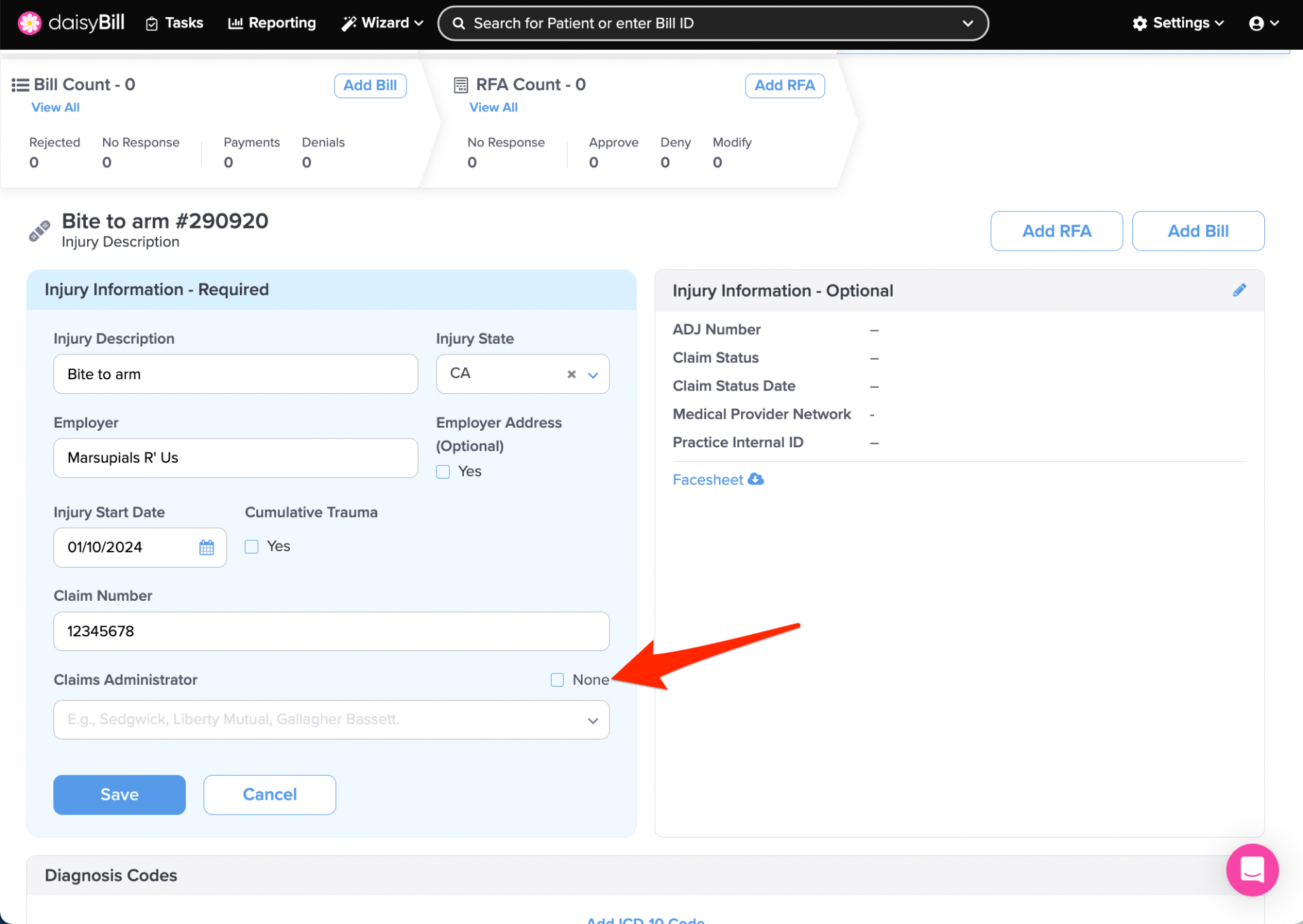 Step 1. From the Injury Page, under ‘Injury Information - Required’, click the ‘None’ checkbox next to the ‘Claims Administrator’ field