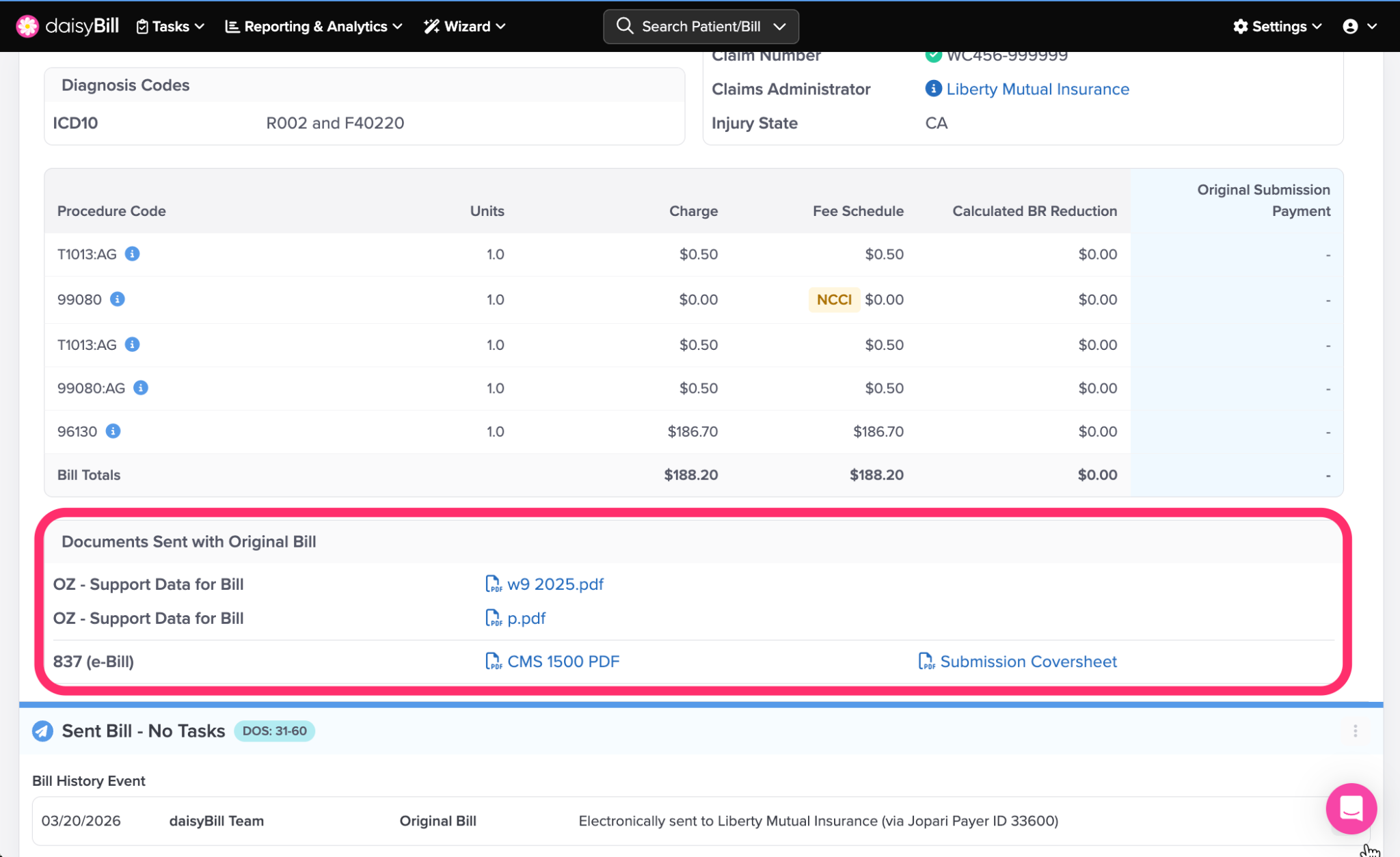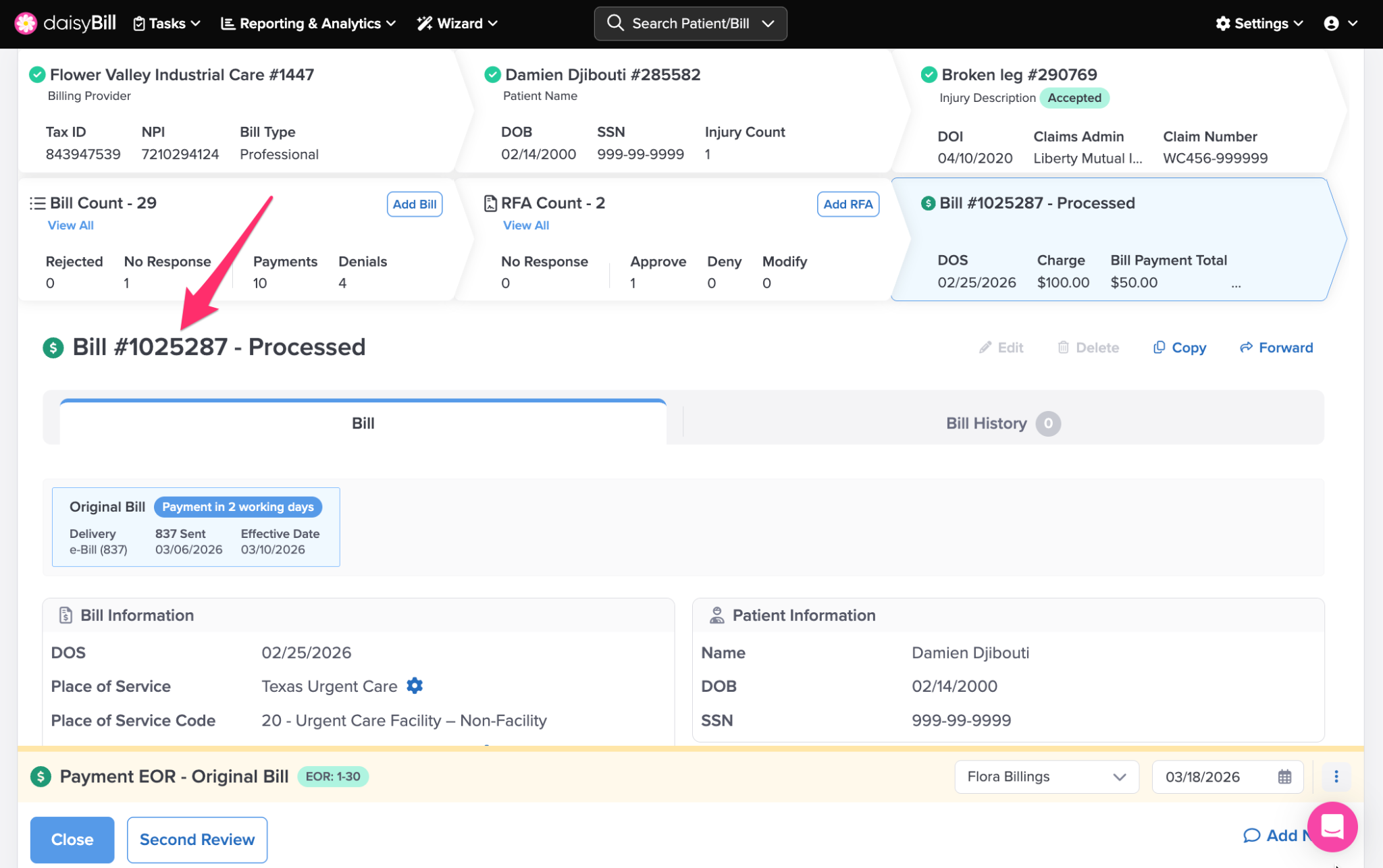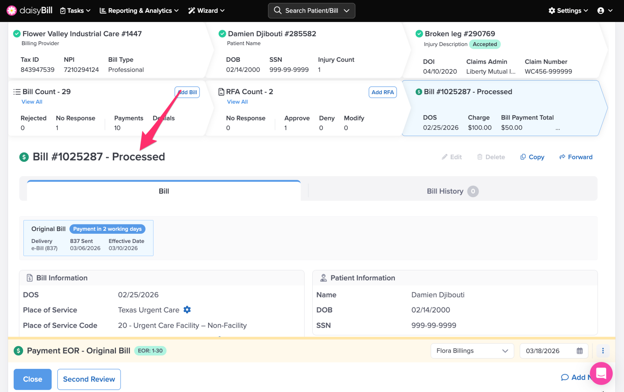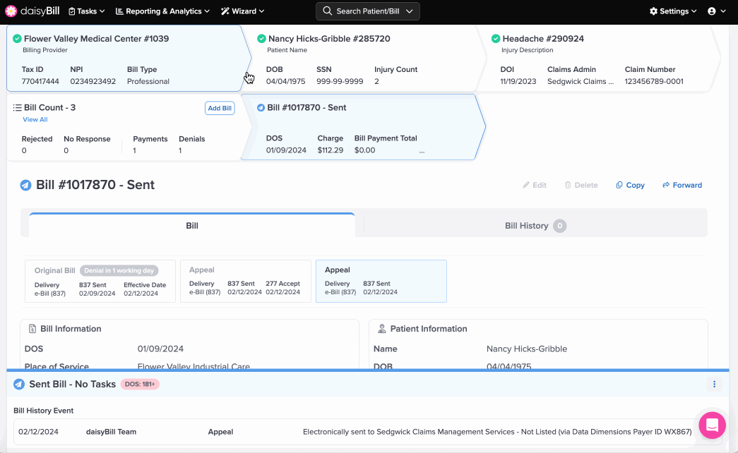 Click the ‘Bill Count’ Breadcrumb to view a full list of bills entered for the patient’s Injury. For more information, see the Help Article: Bill List Explained.