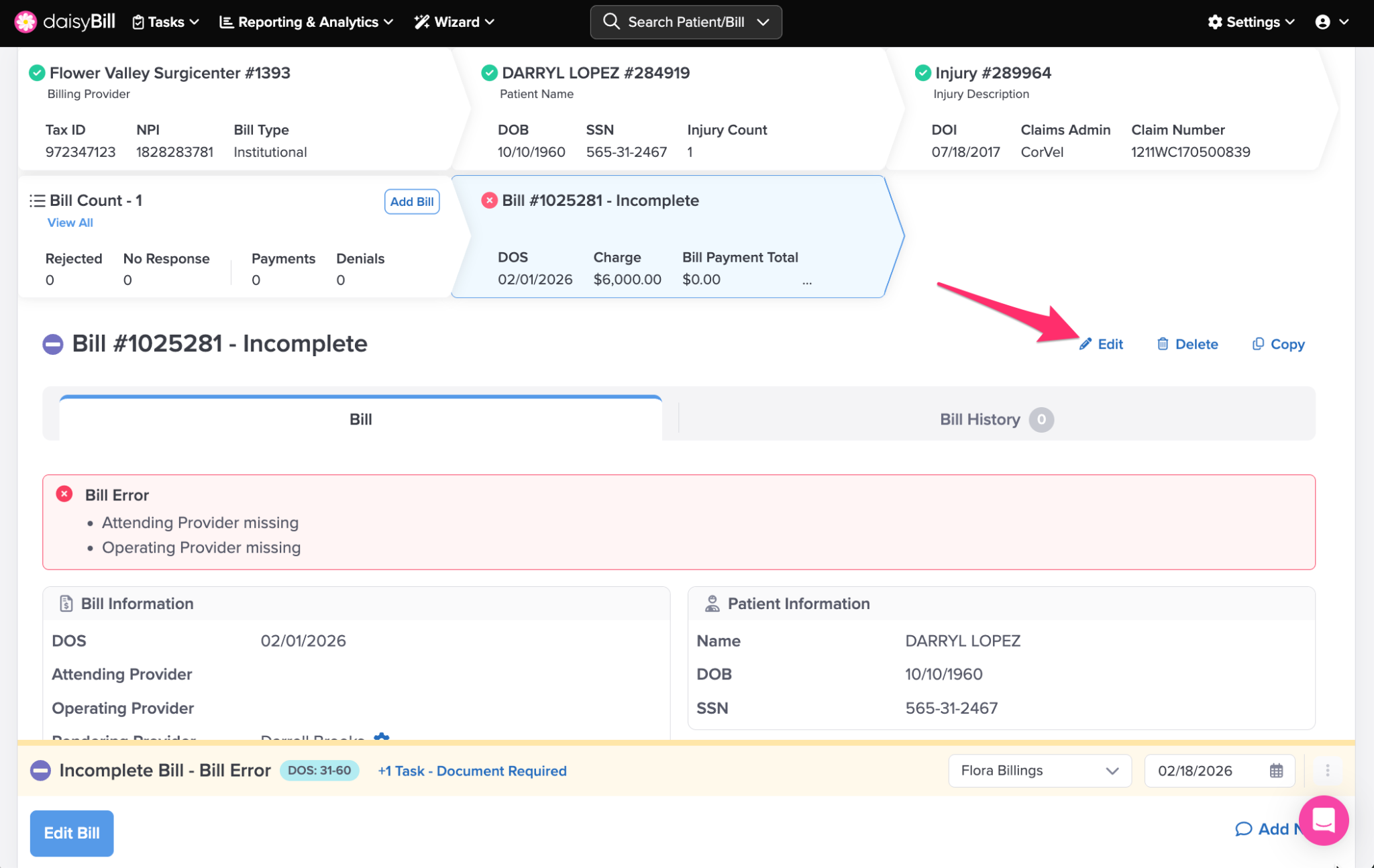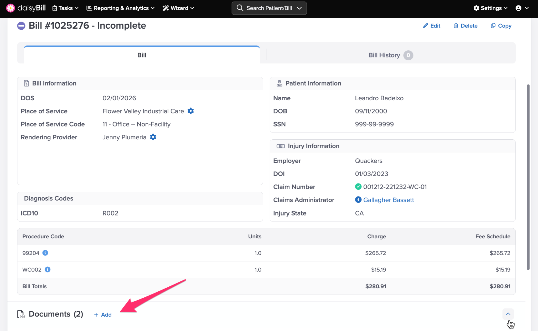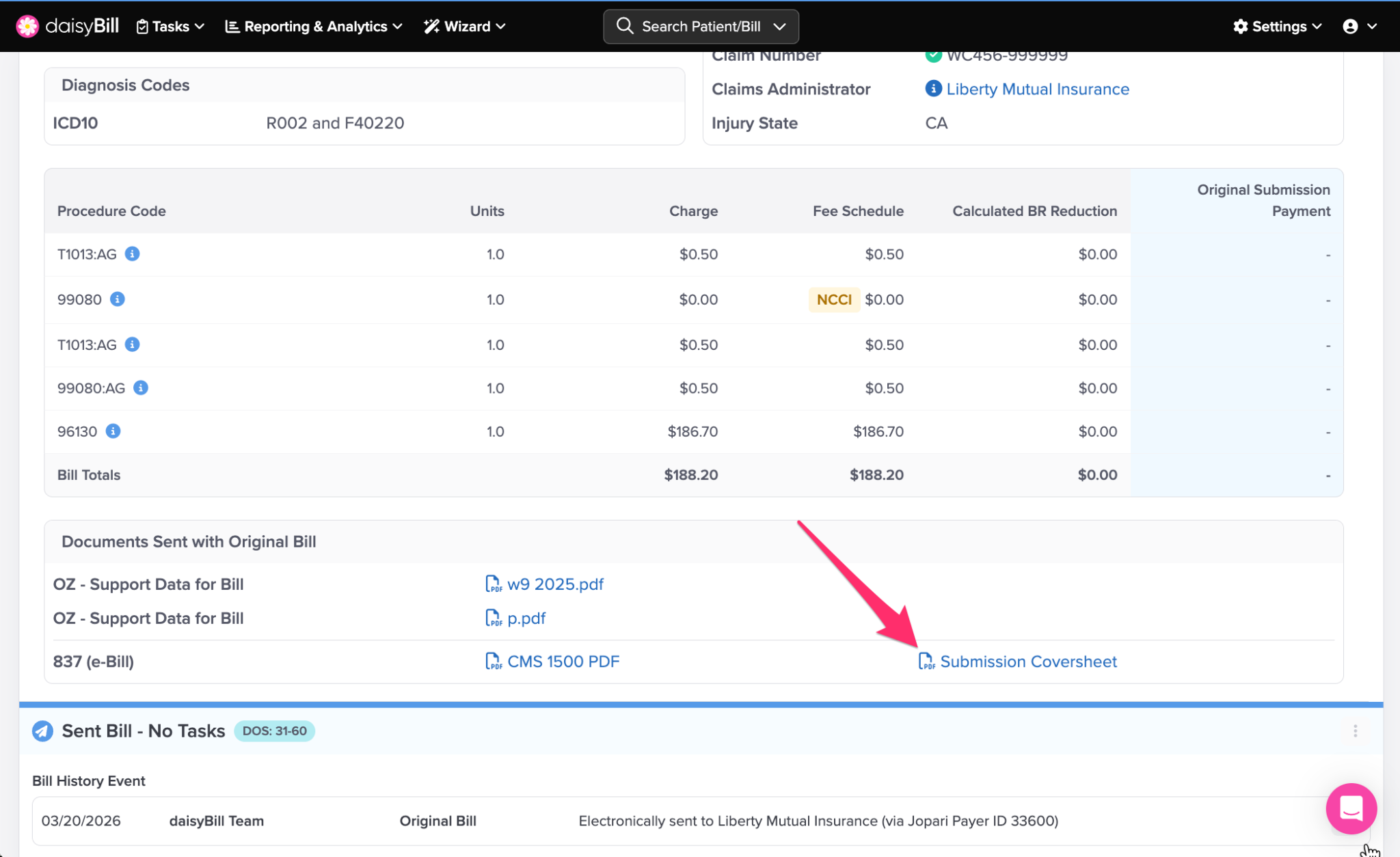 Click the ‘Bill Count’ Breadcrumb to view a full list of bills entered for the patient’s Injury. For more information, see the Help Article: Bill List Explained.