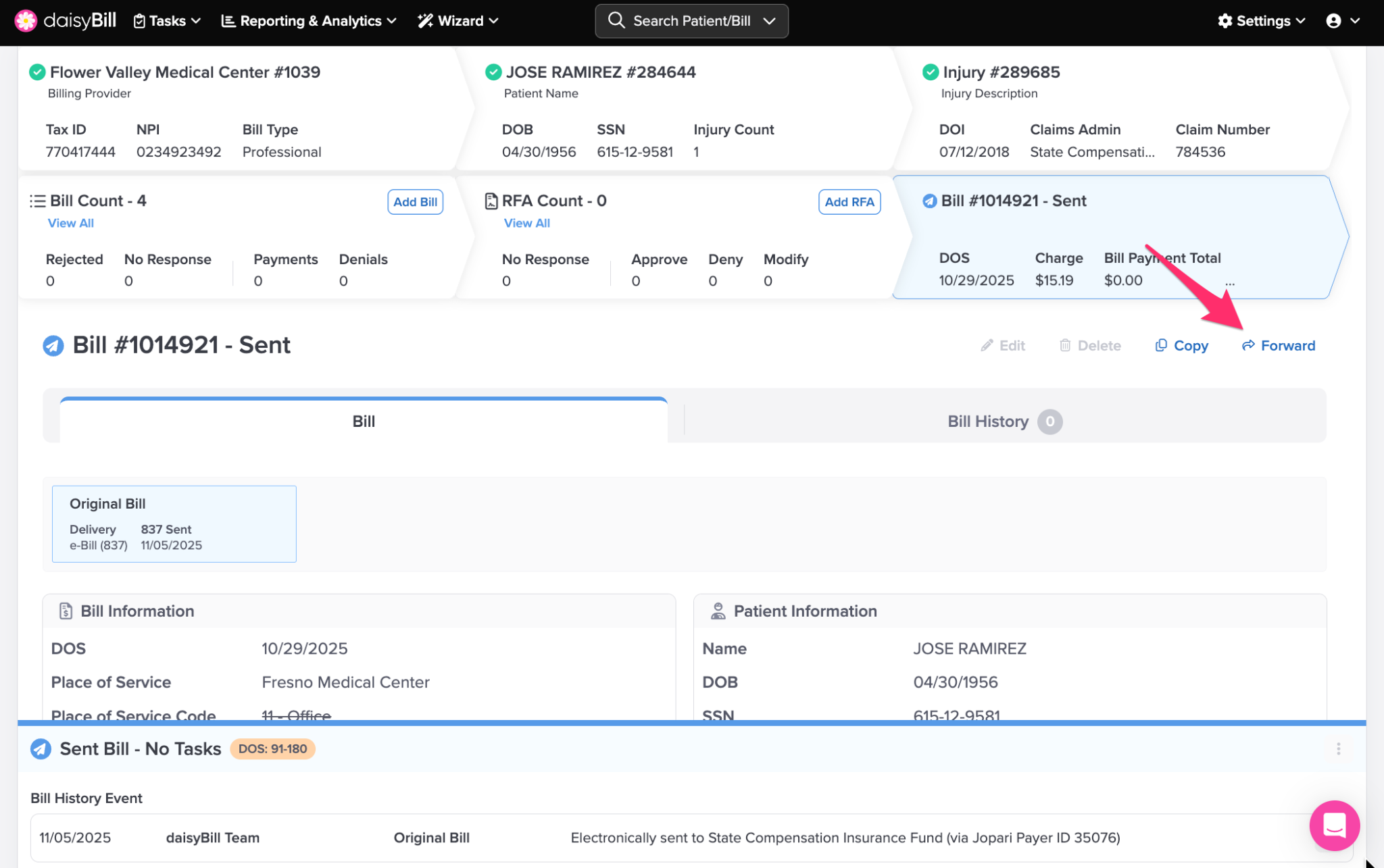 daisyBill allows you to forward a Bill once it has a Sent Status. To forward a Bill, click ‘Forward’. Charges may apply for Bill forwards.