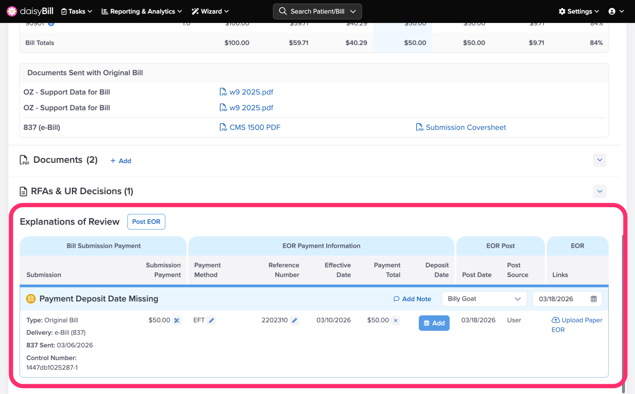 - ‘Explanation of Review’ displays how the EOR information was received, either as a Paper EOR or an electronic EOR. daisyBill provides links to view the EOR.
