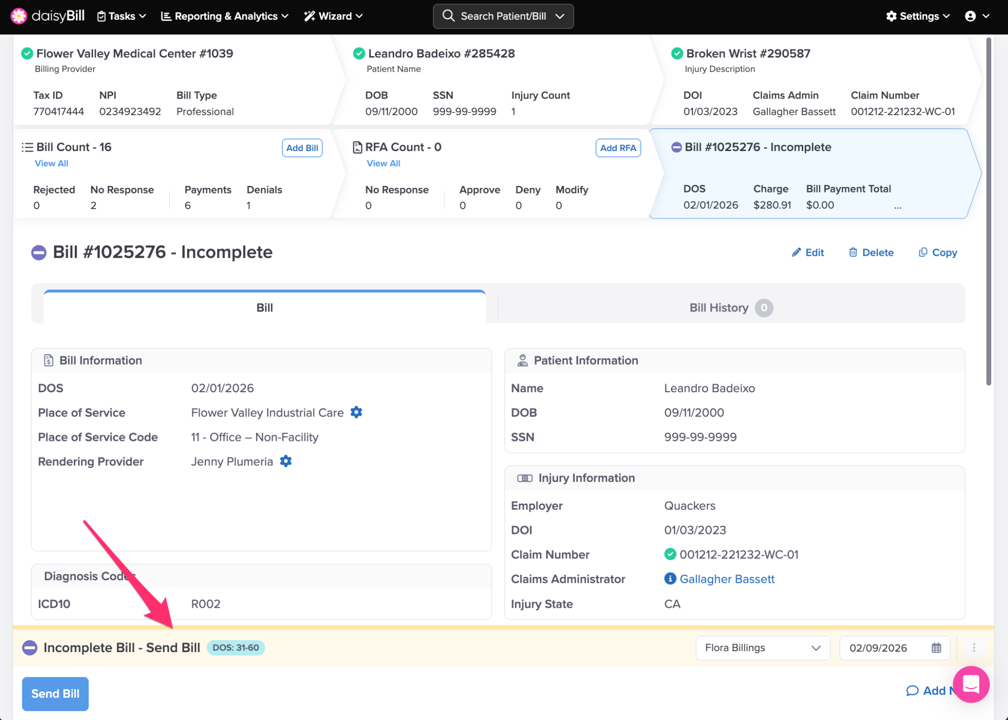 The Bill Count breadcrumb displays the count of Bills submitted for the patient’s Injury, and includes the count of: