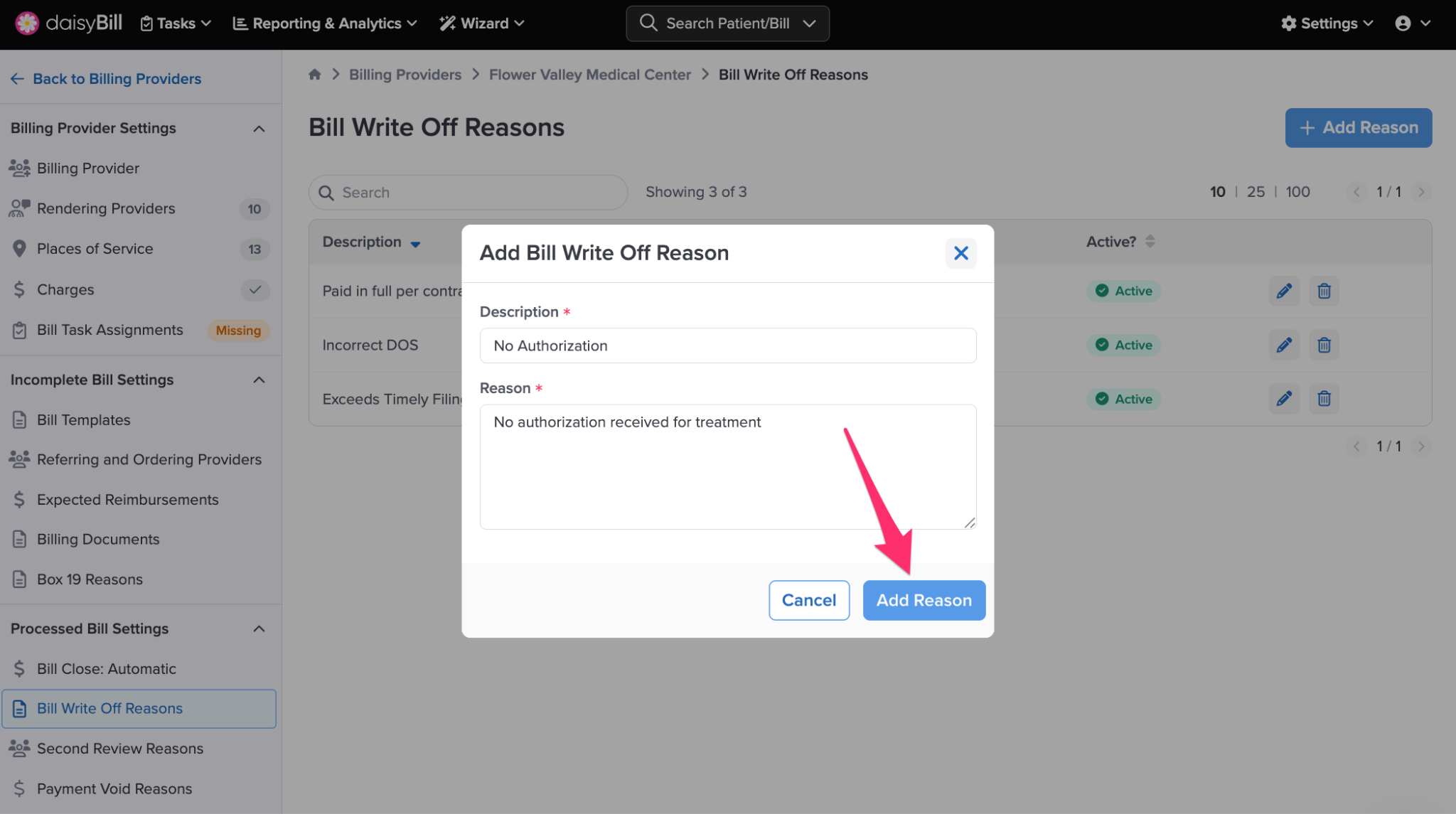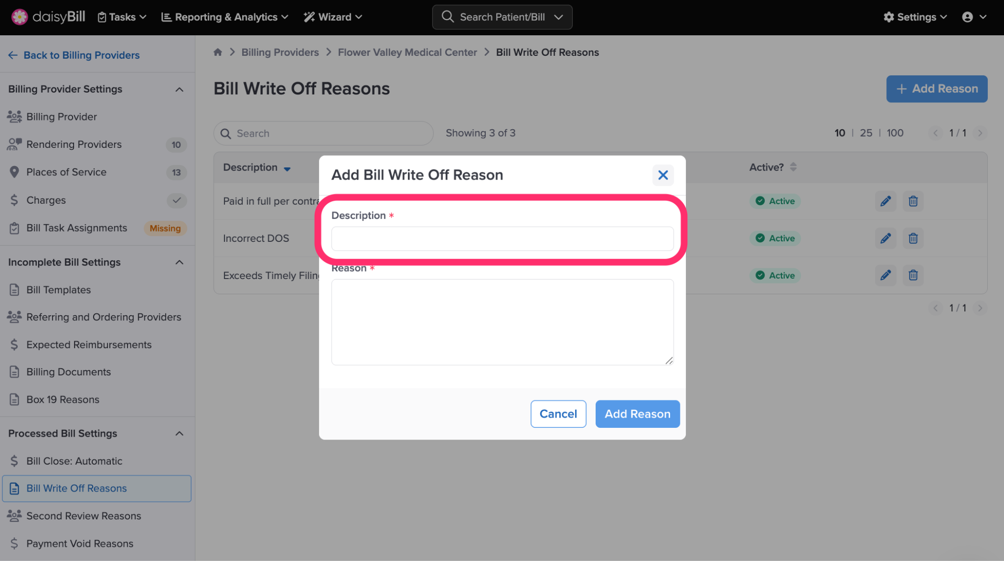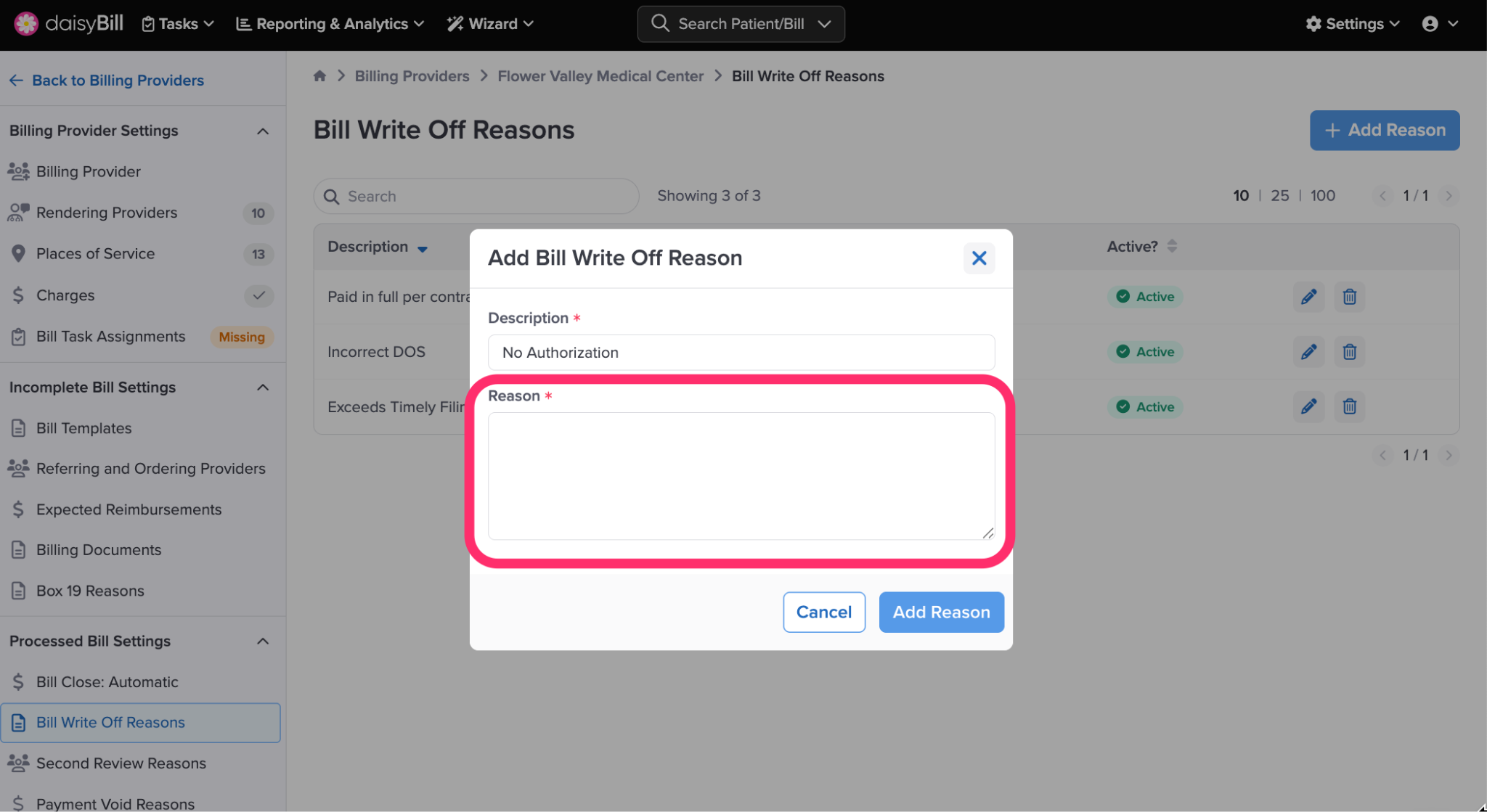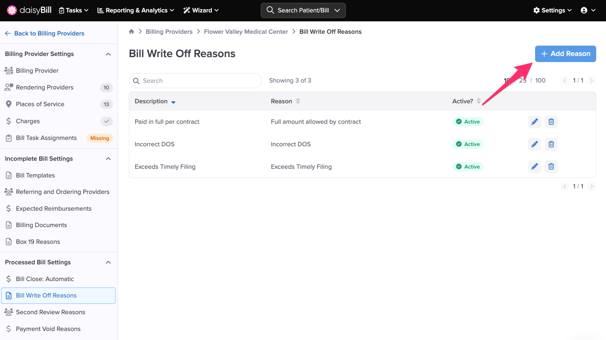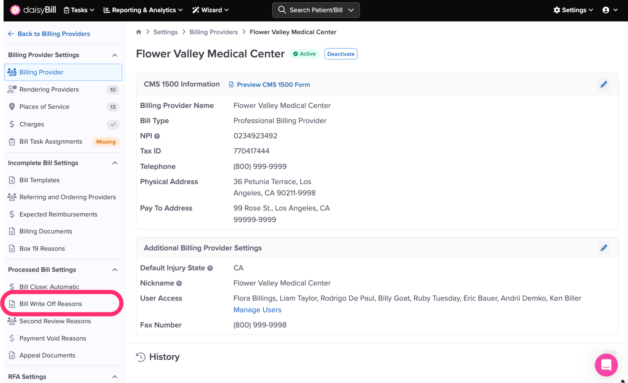 Only daisyBill Users with an Administrator role can manage Bill Write Off Reasons. For accounts with multiple Billing Providers, daisyBill maintains separate Bill Write Off Reasons for each Billing Provider.