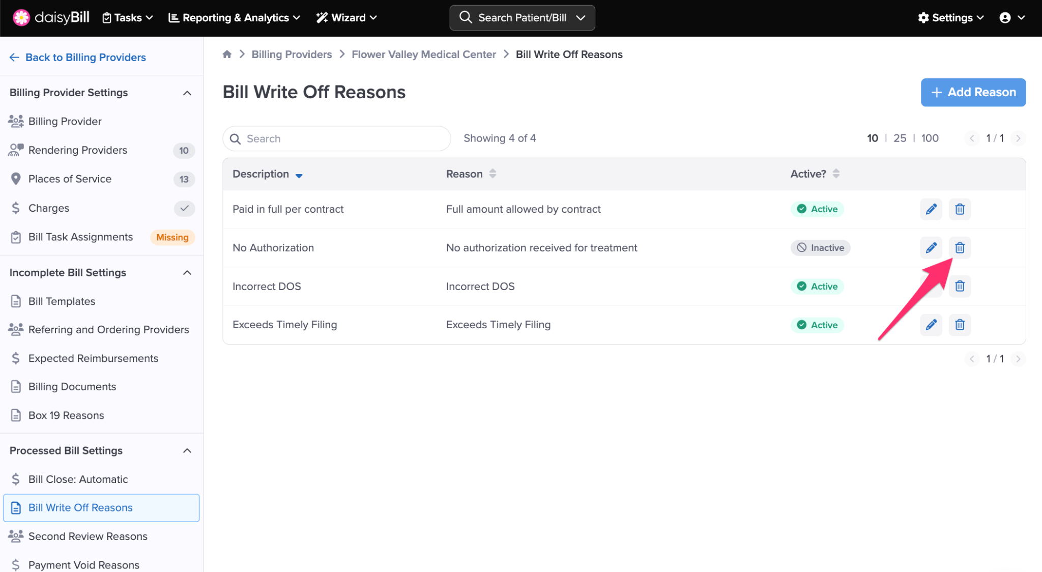 Step 8. (Situational) To delete a Bill Write Off Reason, click the Trashcan icon
