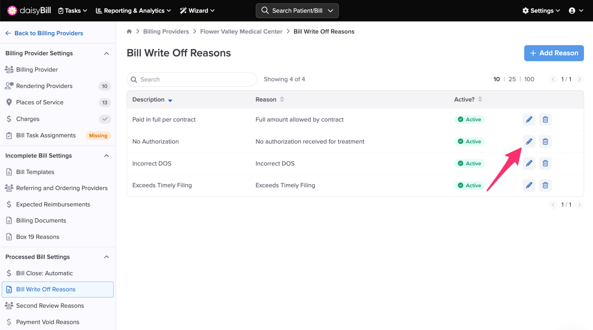 Step 7. (Situational) To edit a Bill Write Off Reason, click the Pencil icon