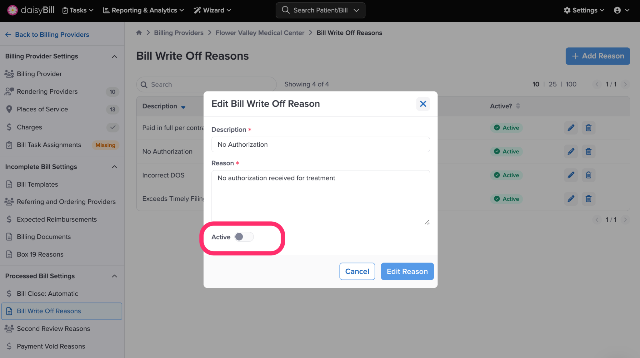 New Bill Write Off Reasons are automatically set as Active. To deactivate a Bill Write Off Reason, toggle the ‘Active’ button off.
