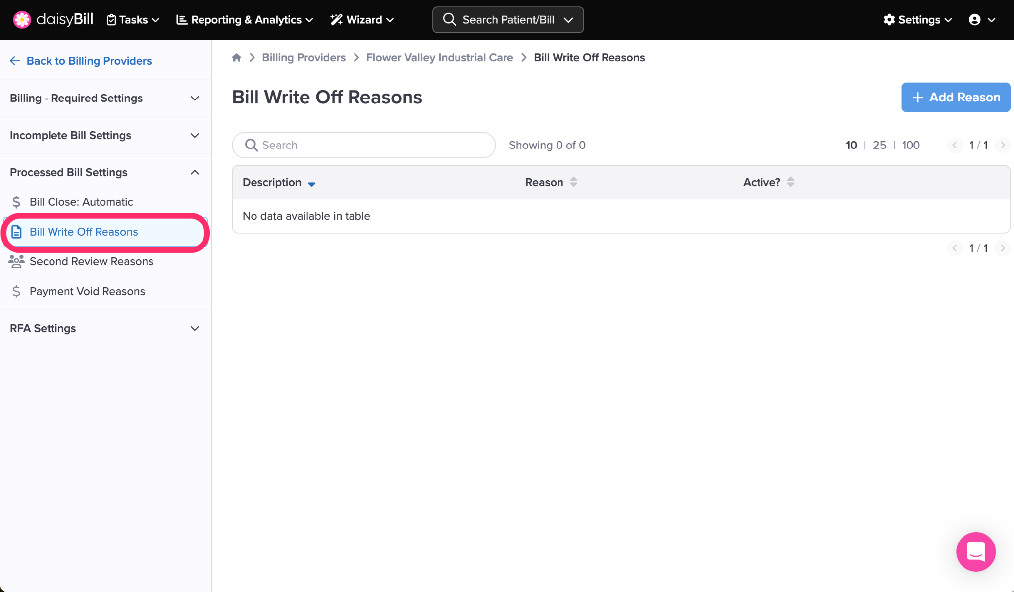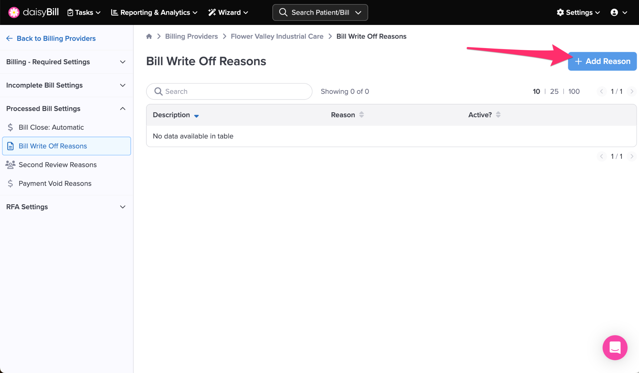 Step 3. To add a new ‘Bill Write Off Reason,’ click the ‘Add Reason’ button