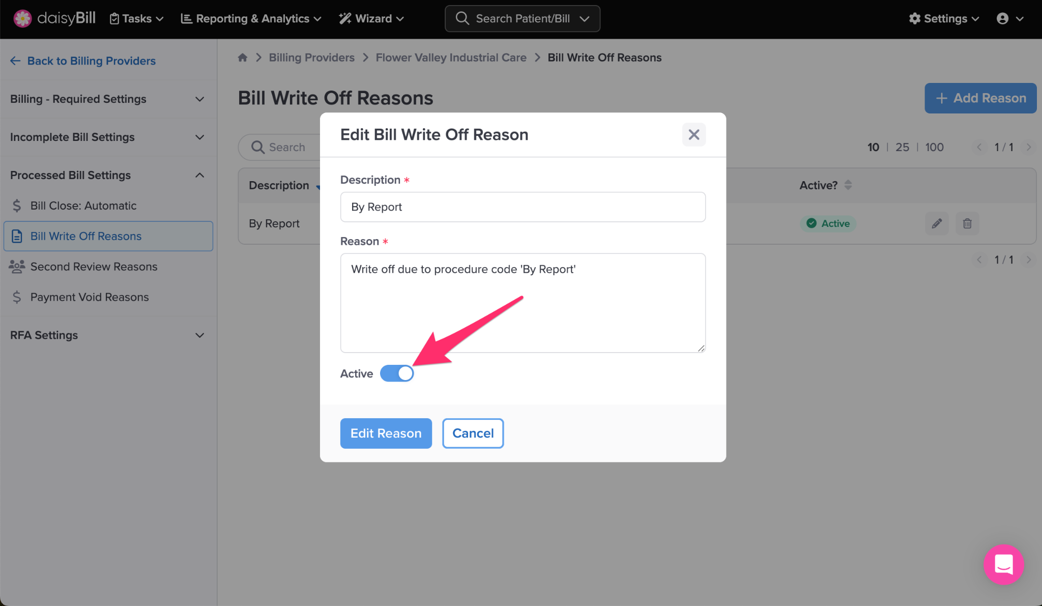 Step 5. To edit a ‘Bill Write Off Reason,’ click the ‘Edit’ icon