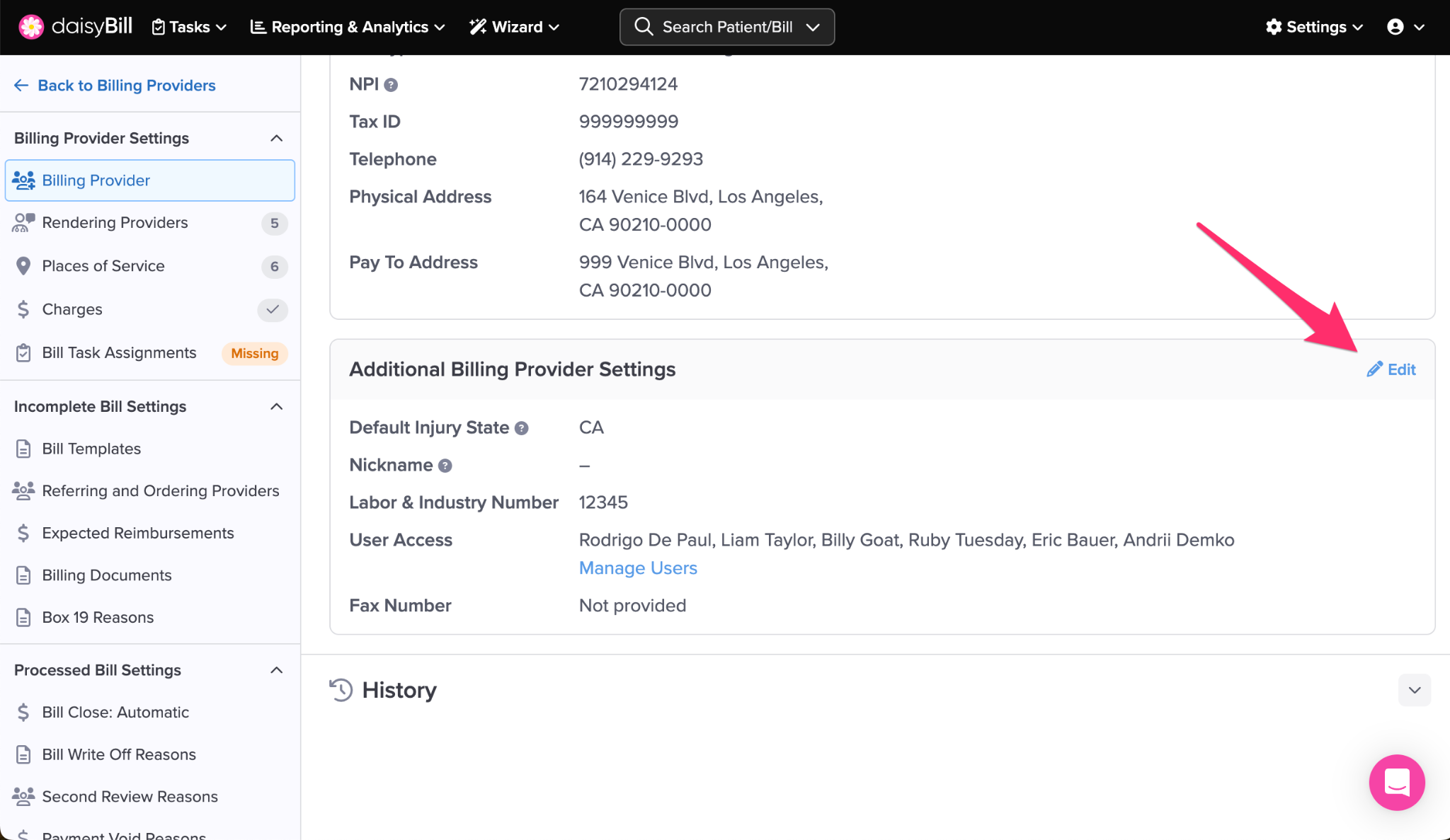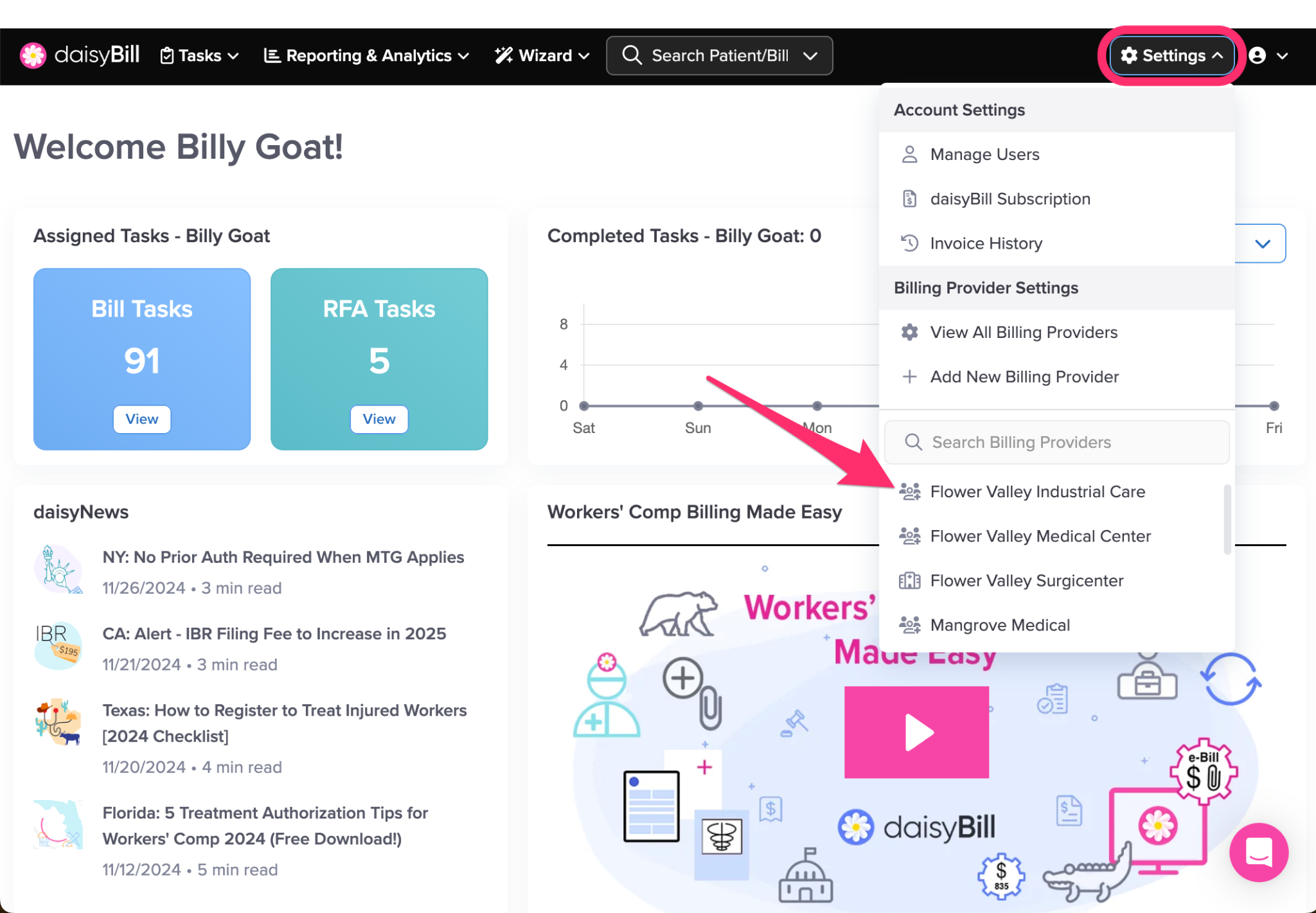 Step 1. On the navigation bar, click ‘Settings’, then click the name of the Billing Provider you are updating