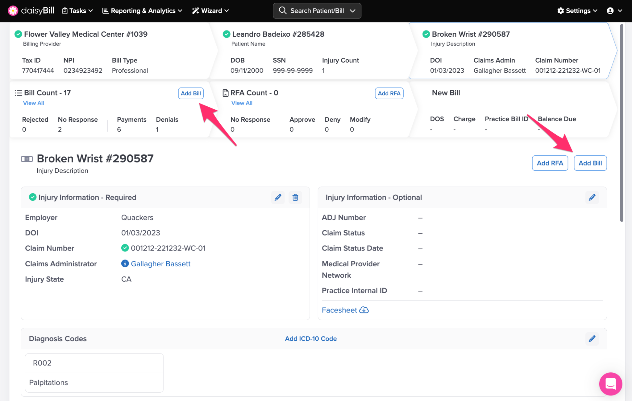 Step 1. From the patient’s Injury Page, click ‘Add Bill’