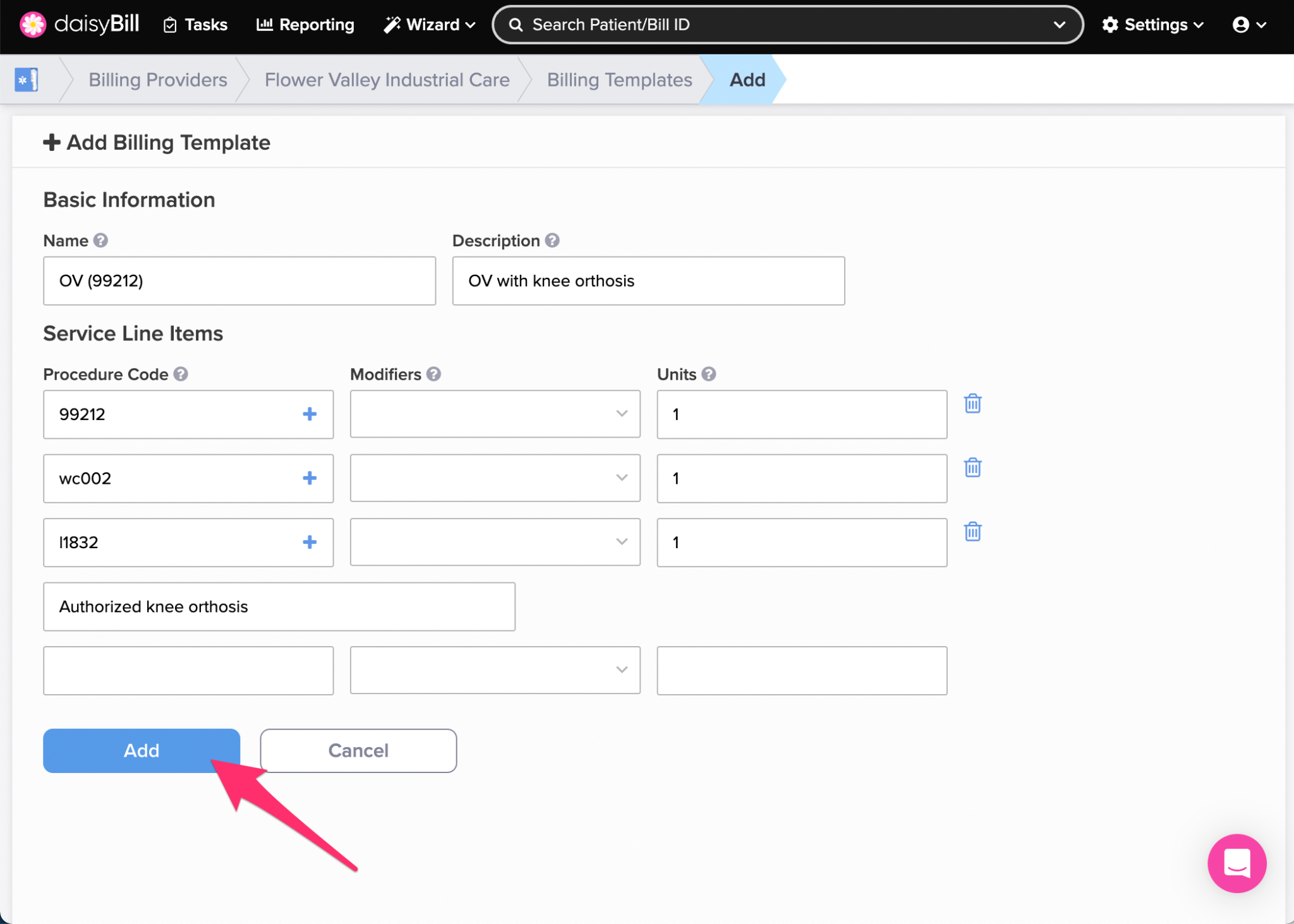 Step 4. Enter the ‘Basic Information’ and ‘Service Line Items’ for the ‘Billing Template,’ then click the ‘Add’ button