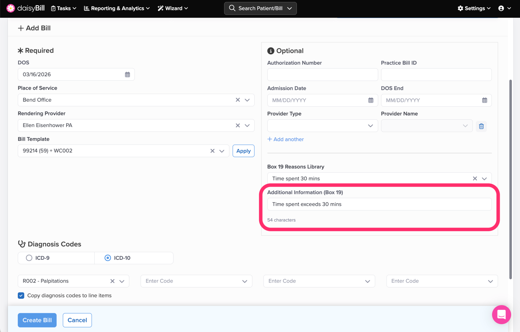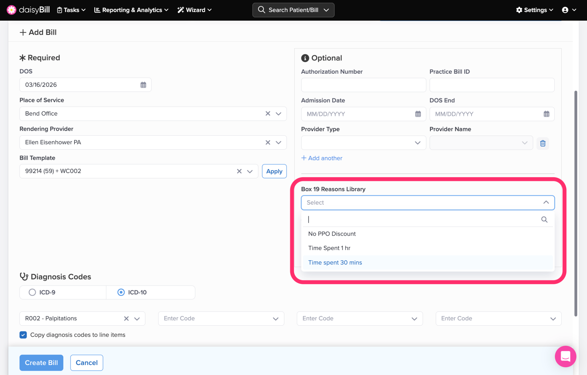 Use Box 19 Reasons quickly add saved standard language to the Optional Bill Information section.