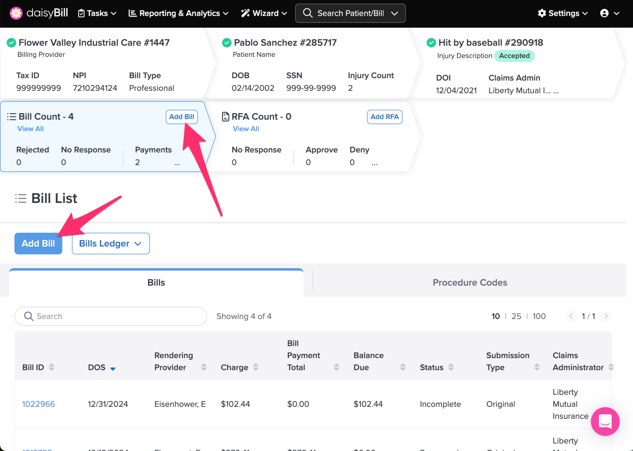 Step 1. From the Injury page, click the ‘Bill Count’ breadcrumb