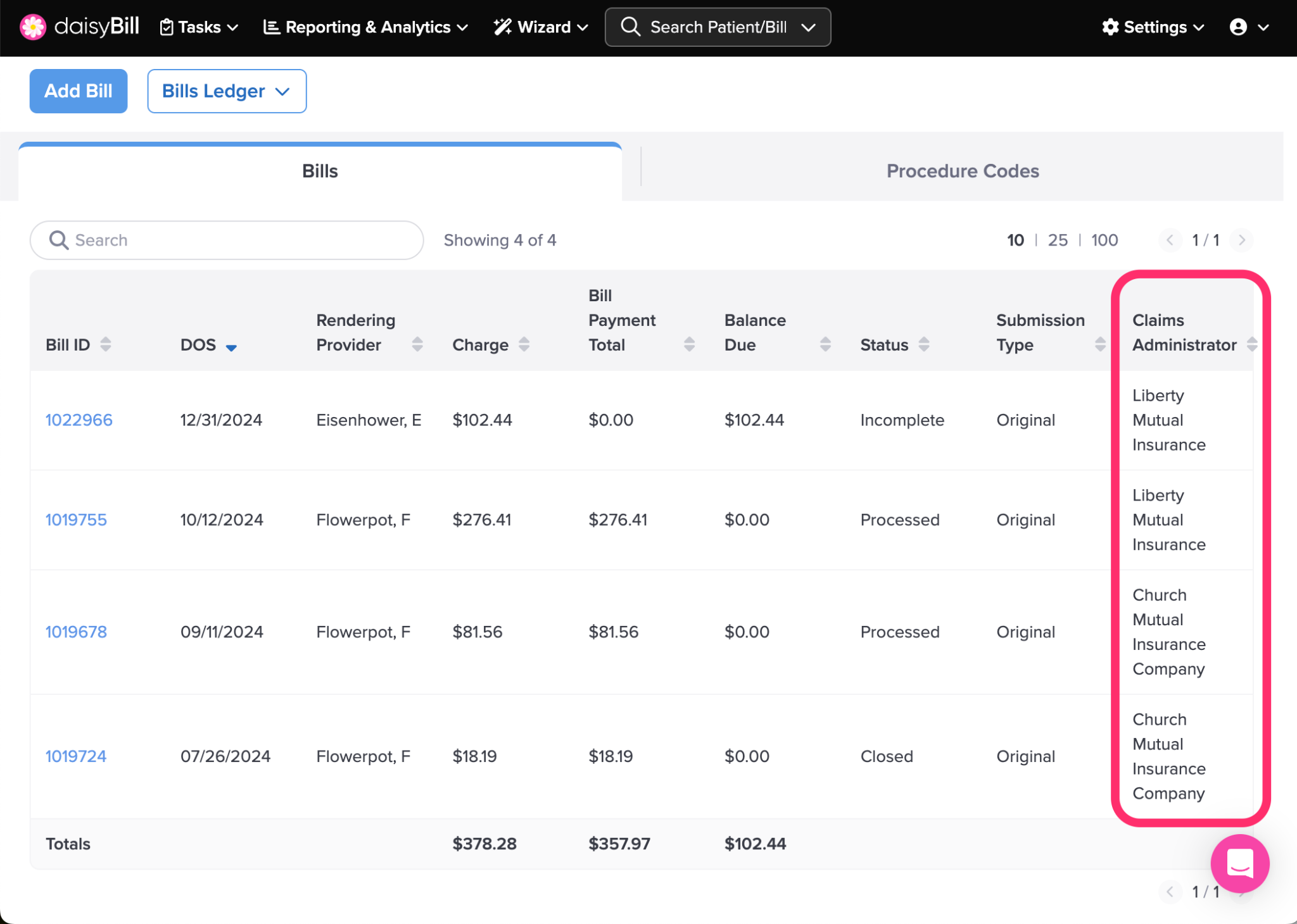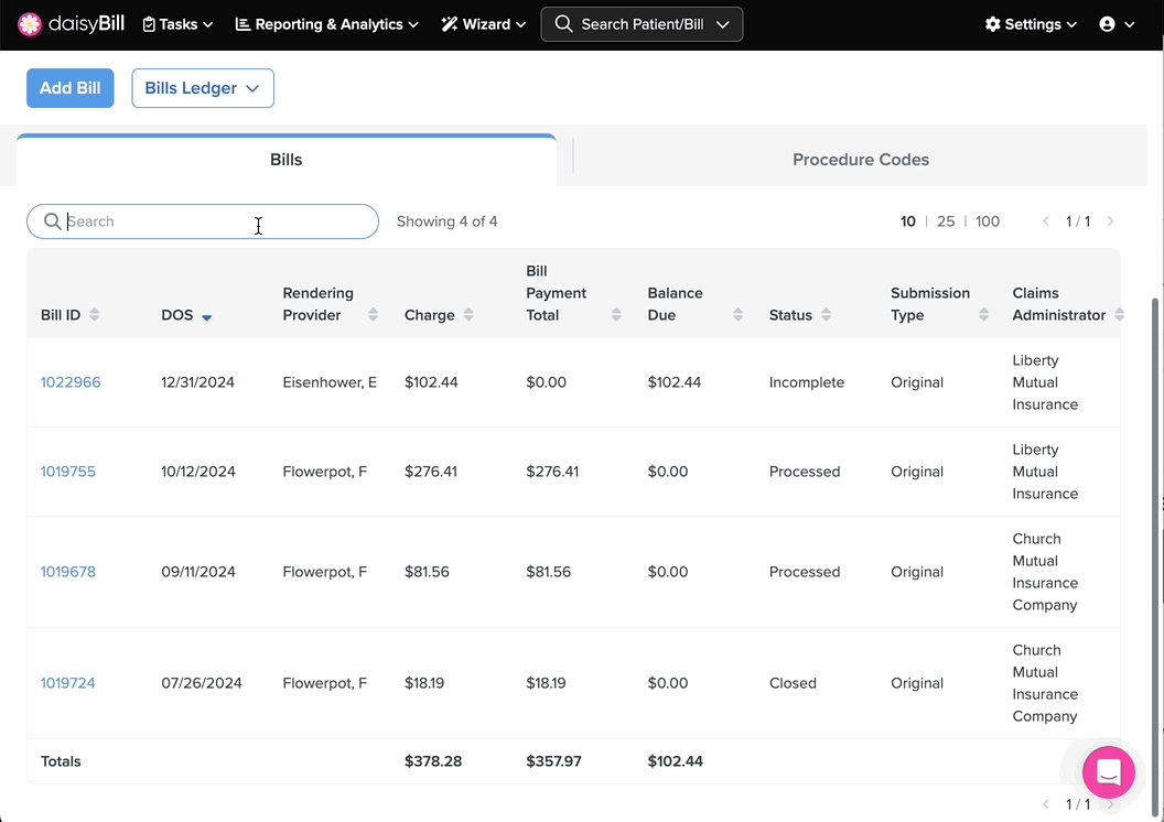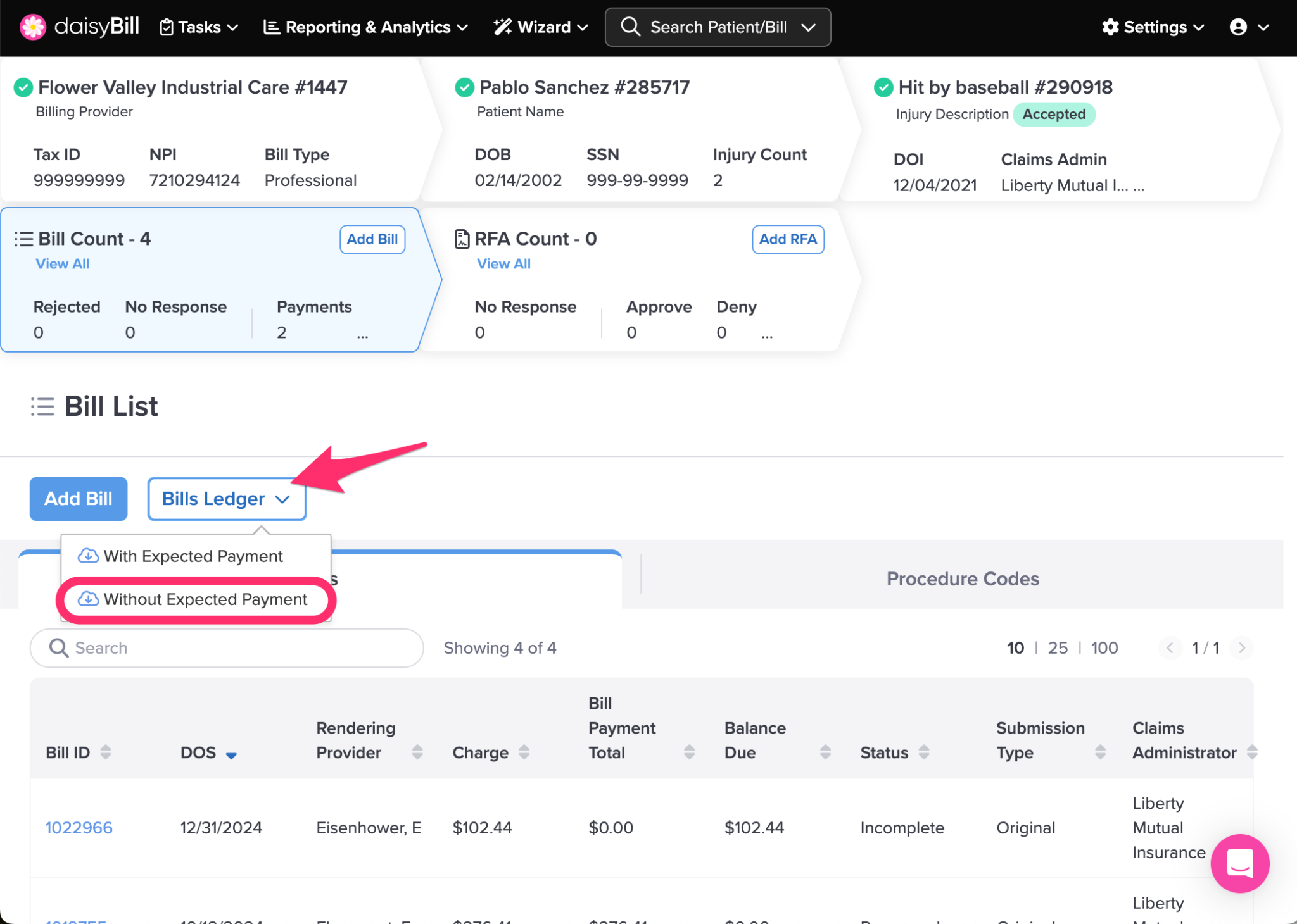 The Bill Count page lets you check all bills for an injury at a glance to view status, payment, balance, and more!