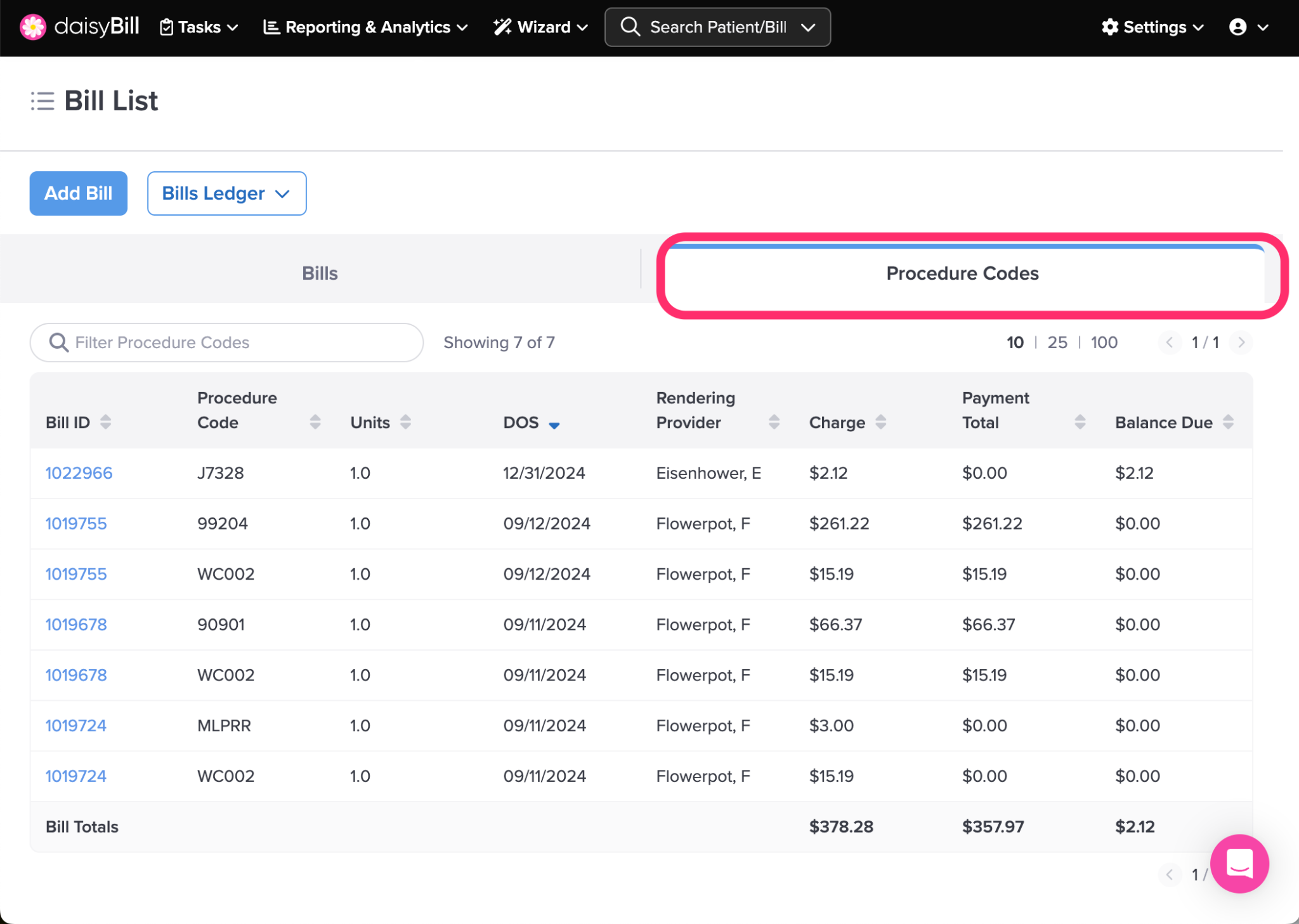 E. To view all Procedure Codes billed, click the ‘Procedure Codes’ tab