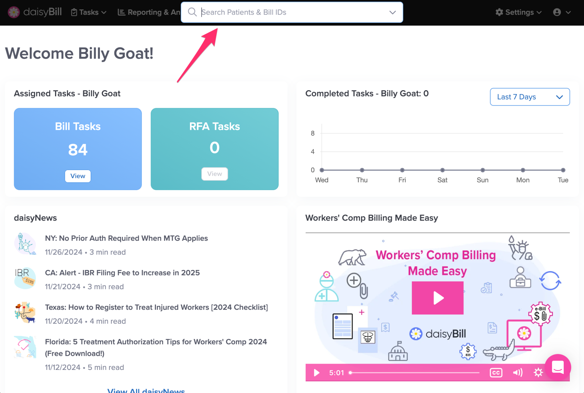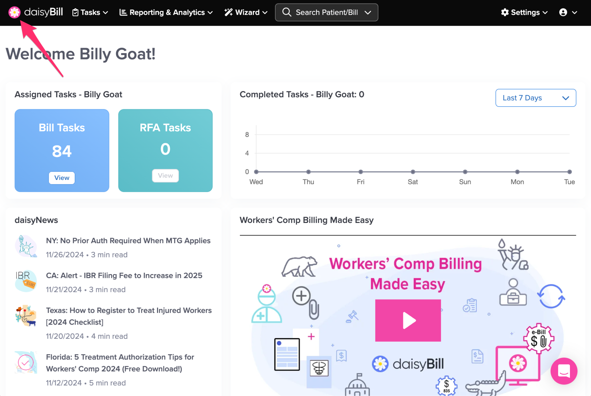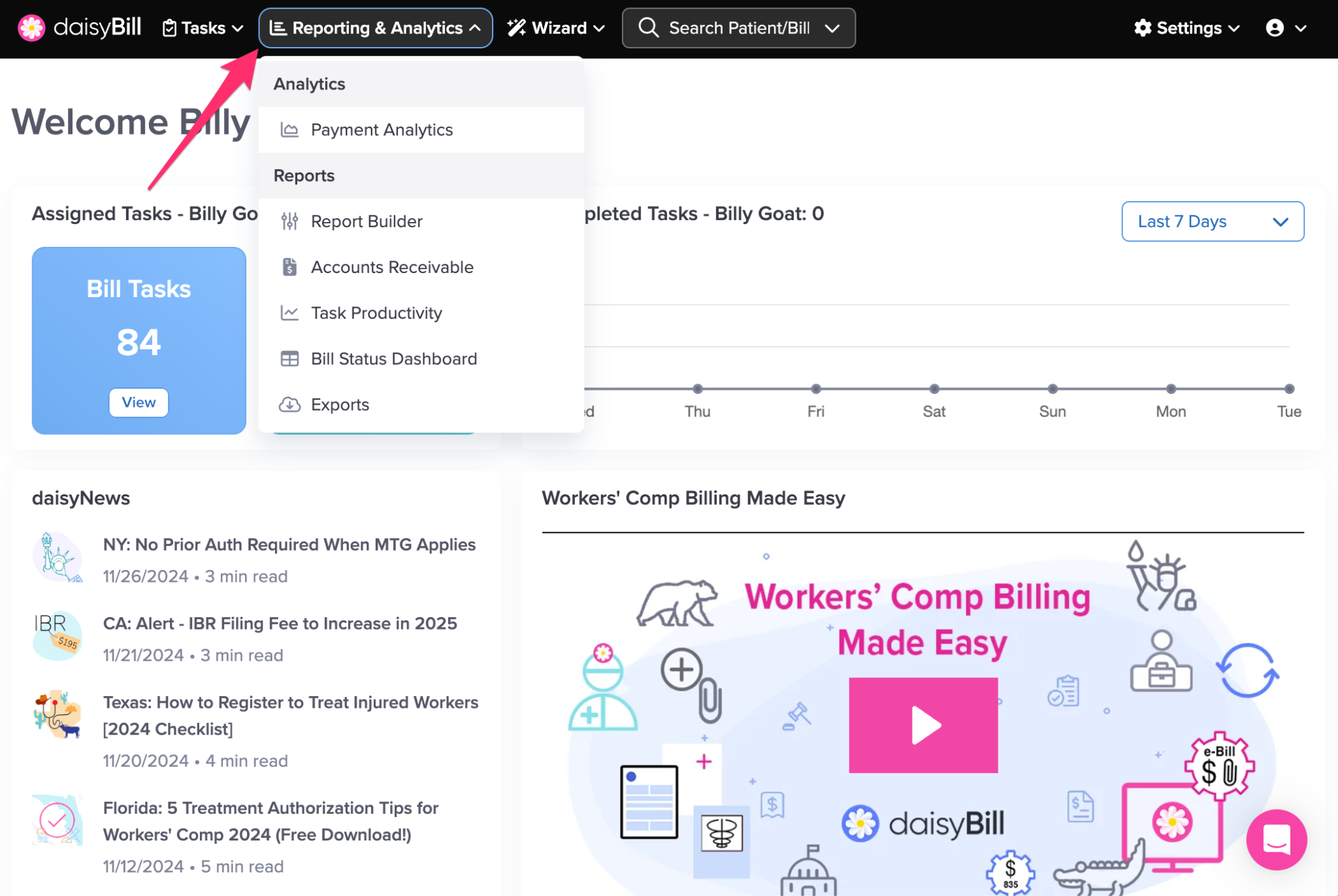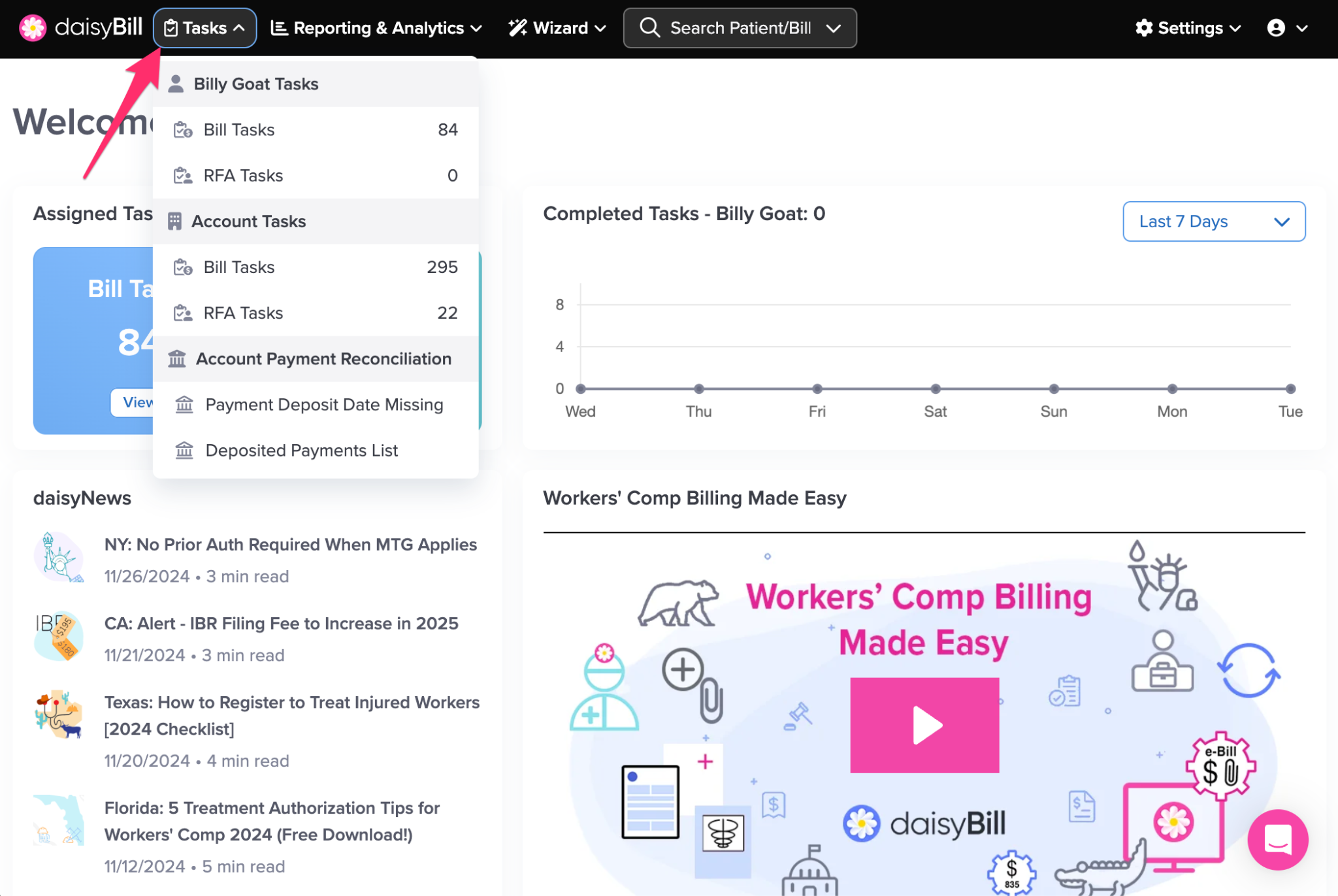 The navigation bar gives you access to everything in your daisyBill account, including Tasks, reporting, settings, and tools.