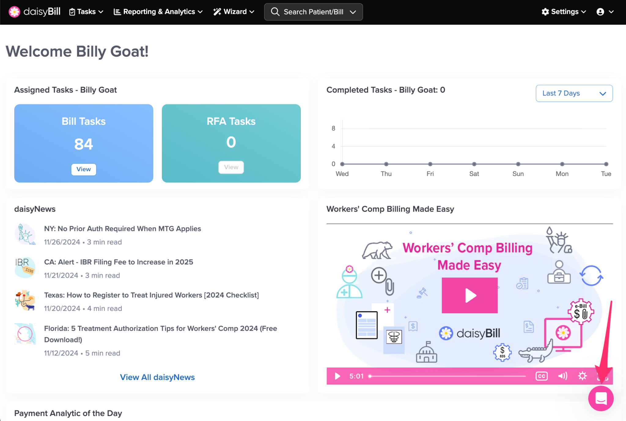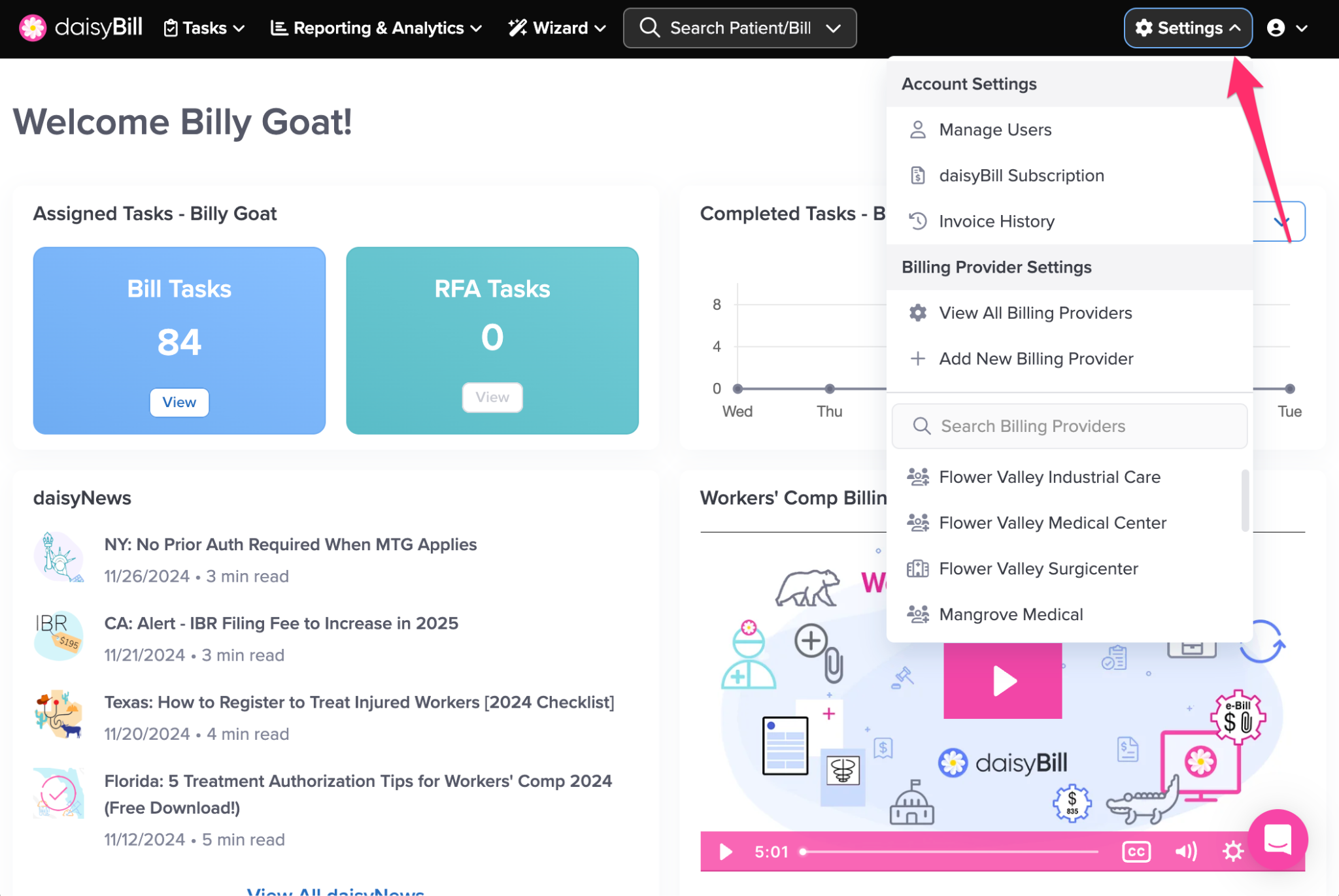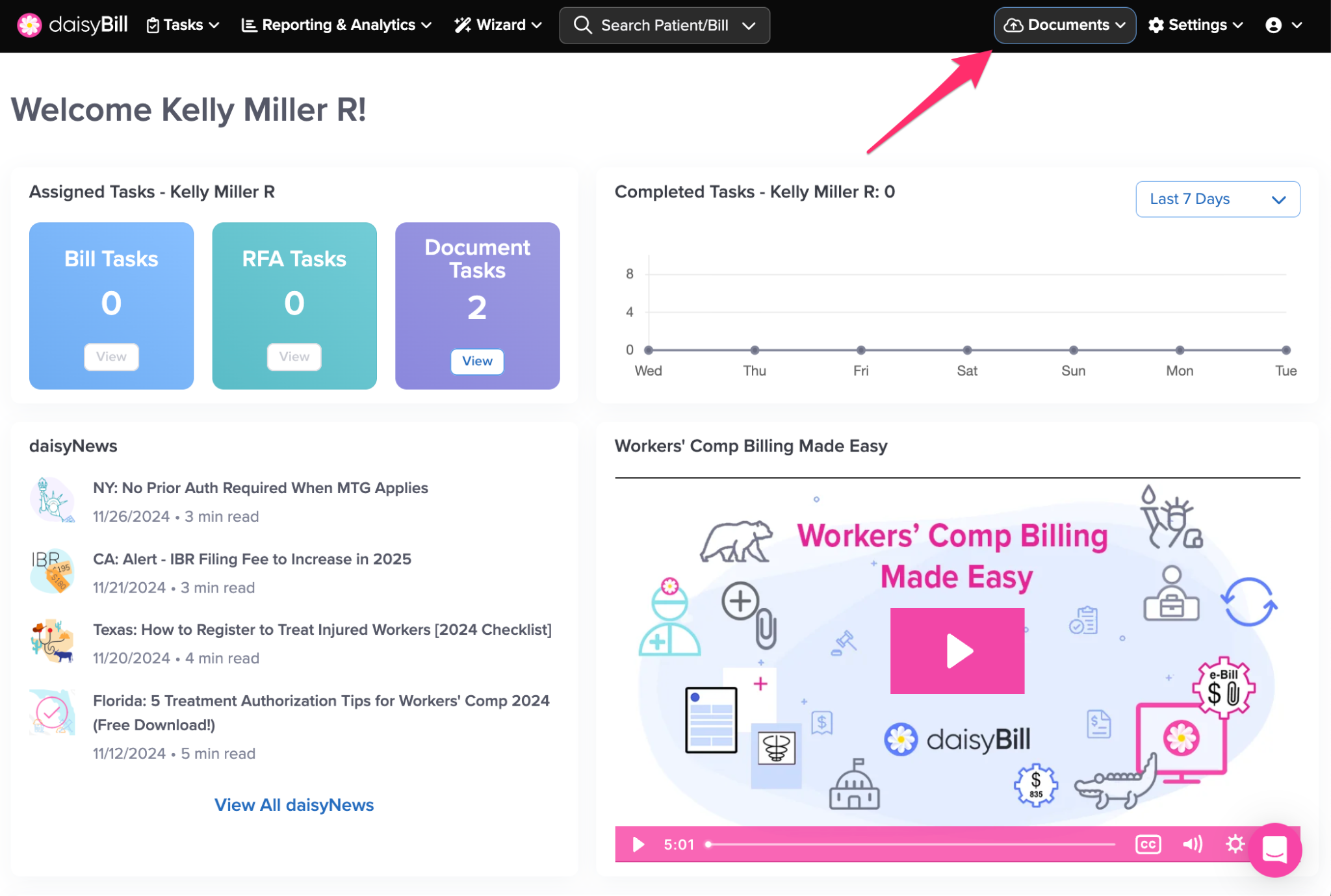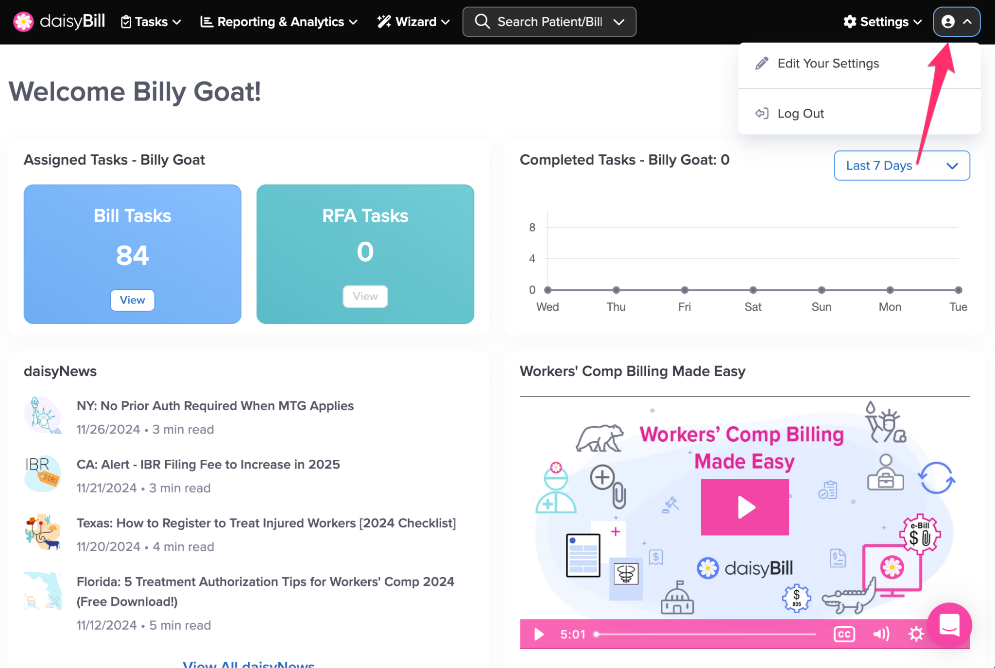 The navigation bar gives you access to everything in your daisyBill account, including Tasks, reporting, settings, and tools.