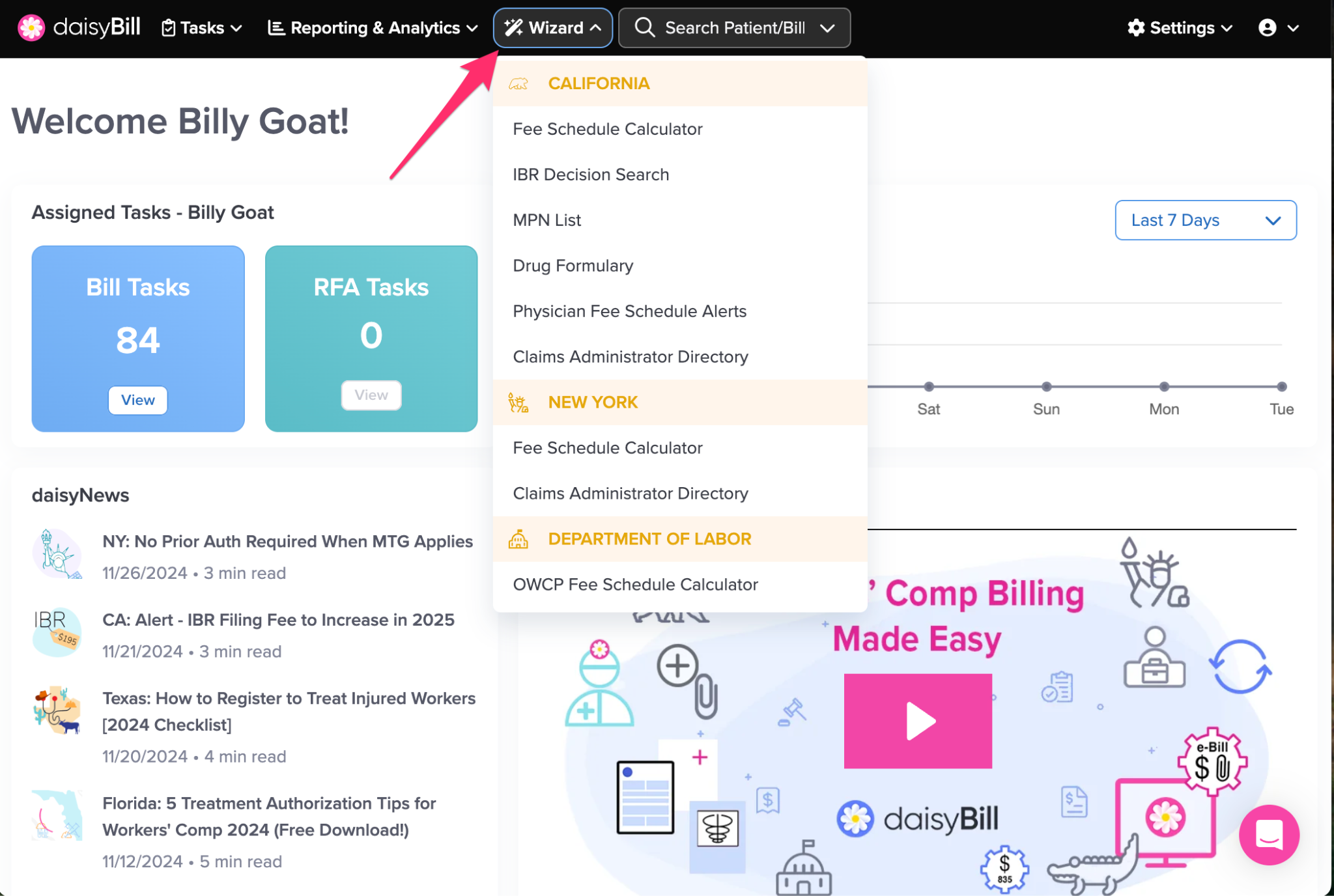 The Wizard provides access to the daisyWizard suite of research and compliance tools, including fee schedule calculators, IBR Decision Search, the Claims Administrator Directory, MPN List, Drug Formulary, and Physician Fee Schedule Alerts.