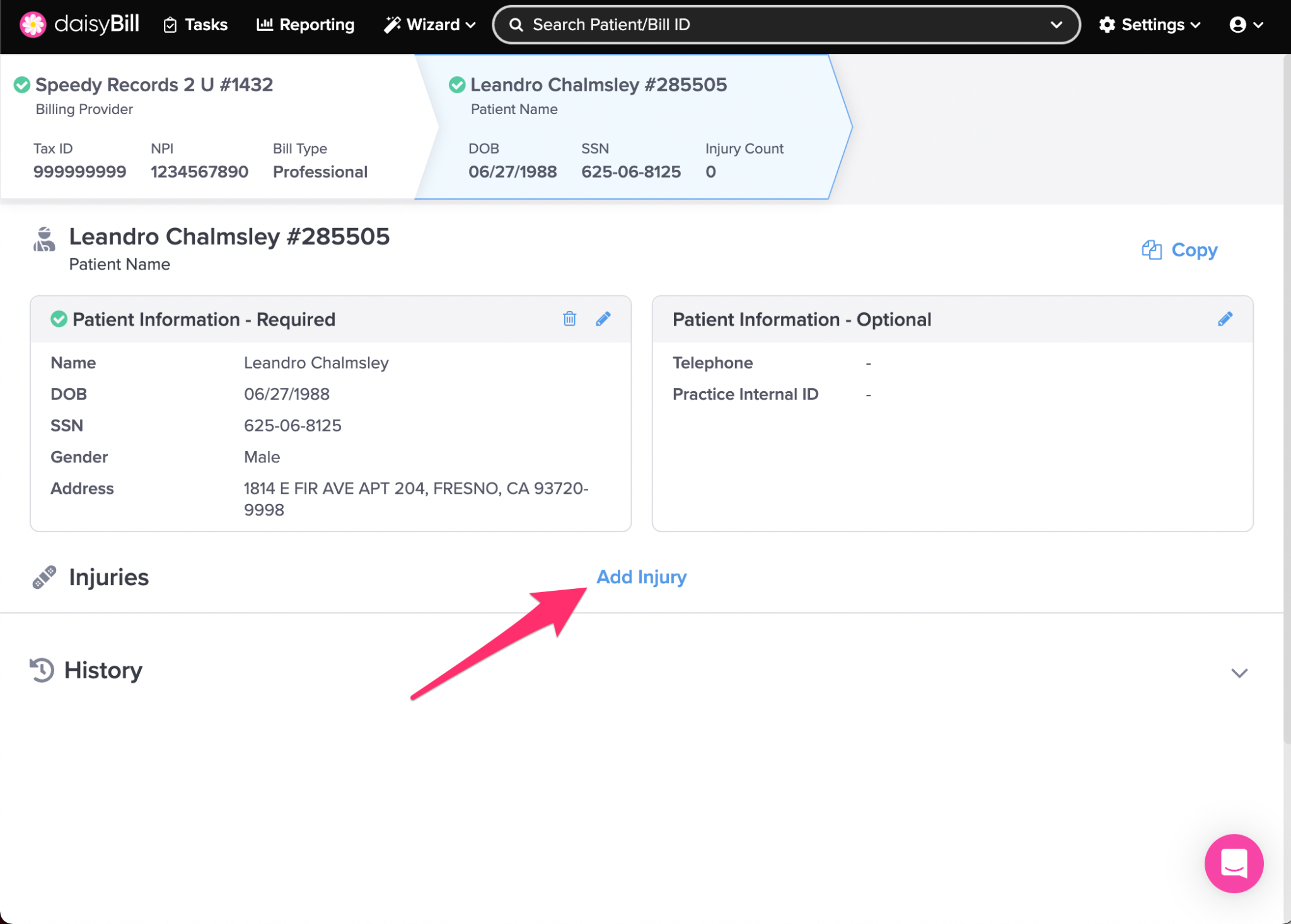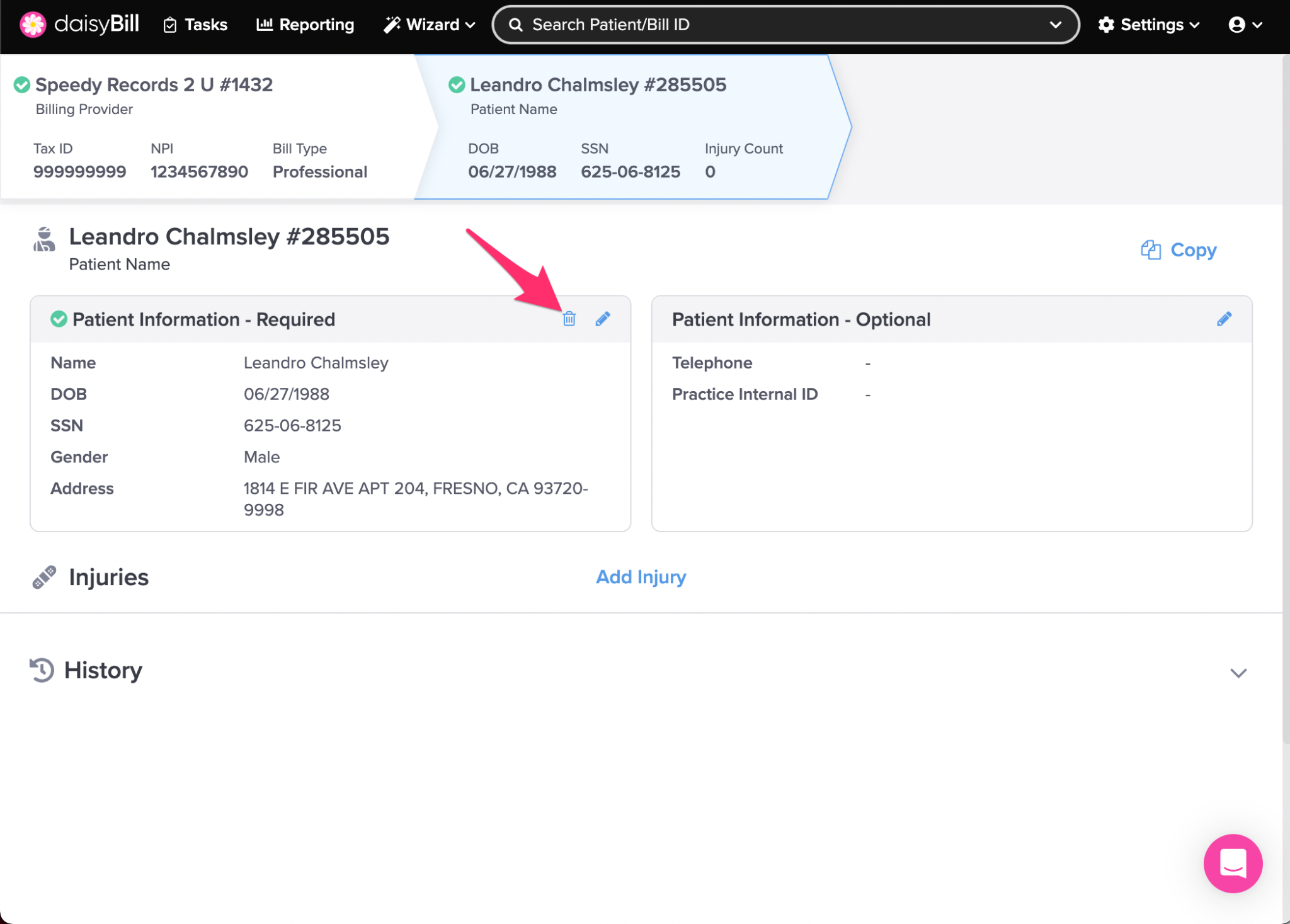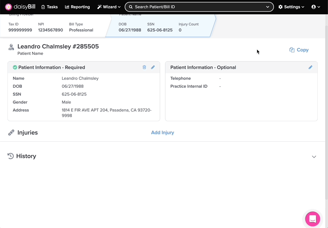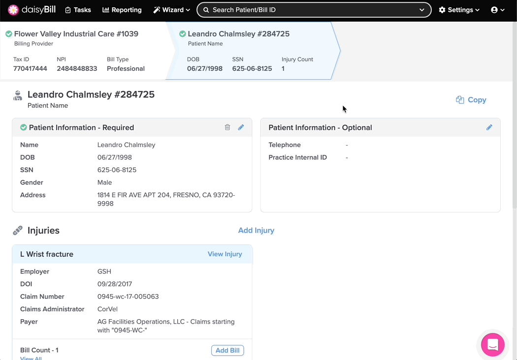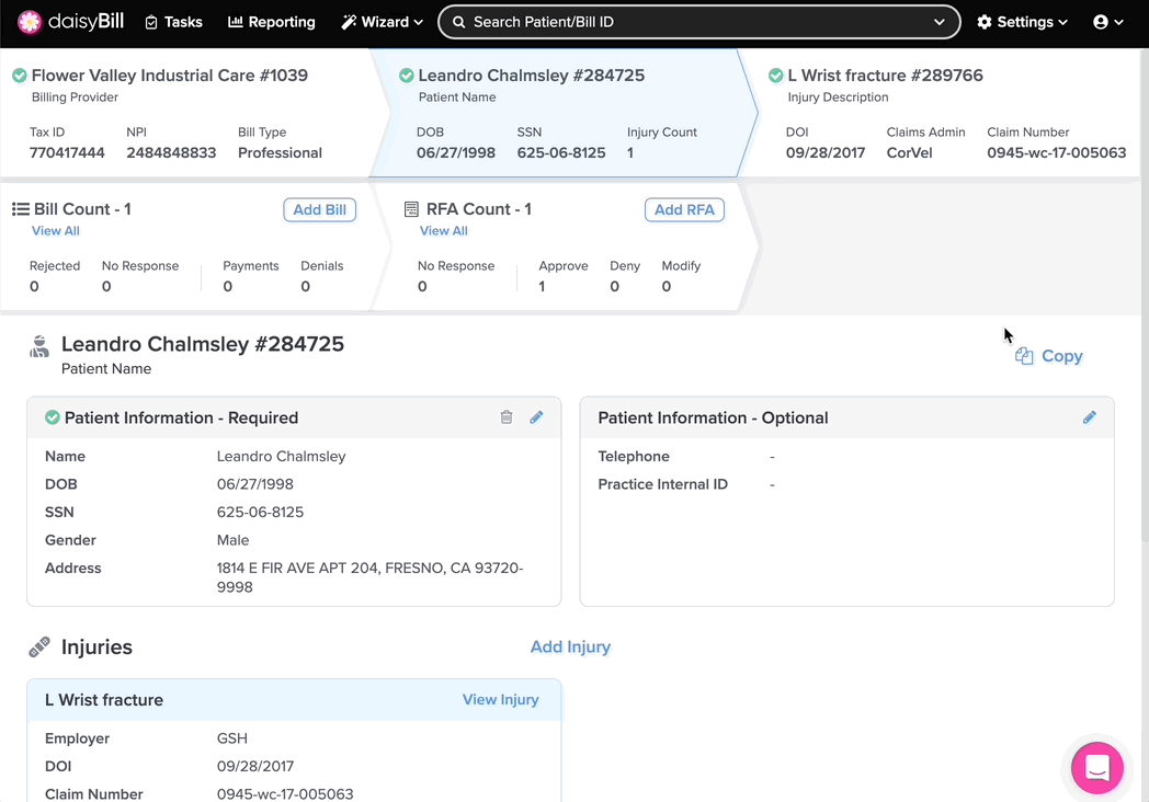 Need to see or change patient information? The Patient page is the right place! The Patient page displays important information for registered patients in your daisyBill account, including all their associated injuries.