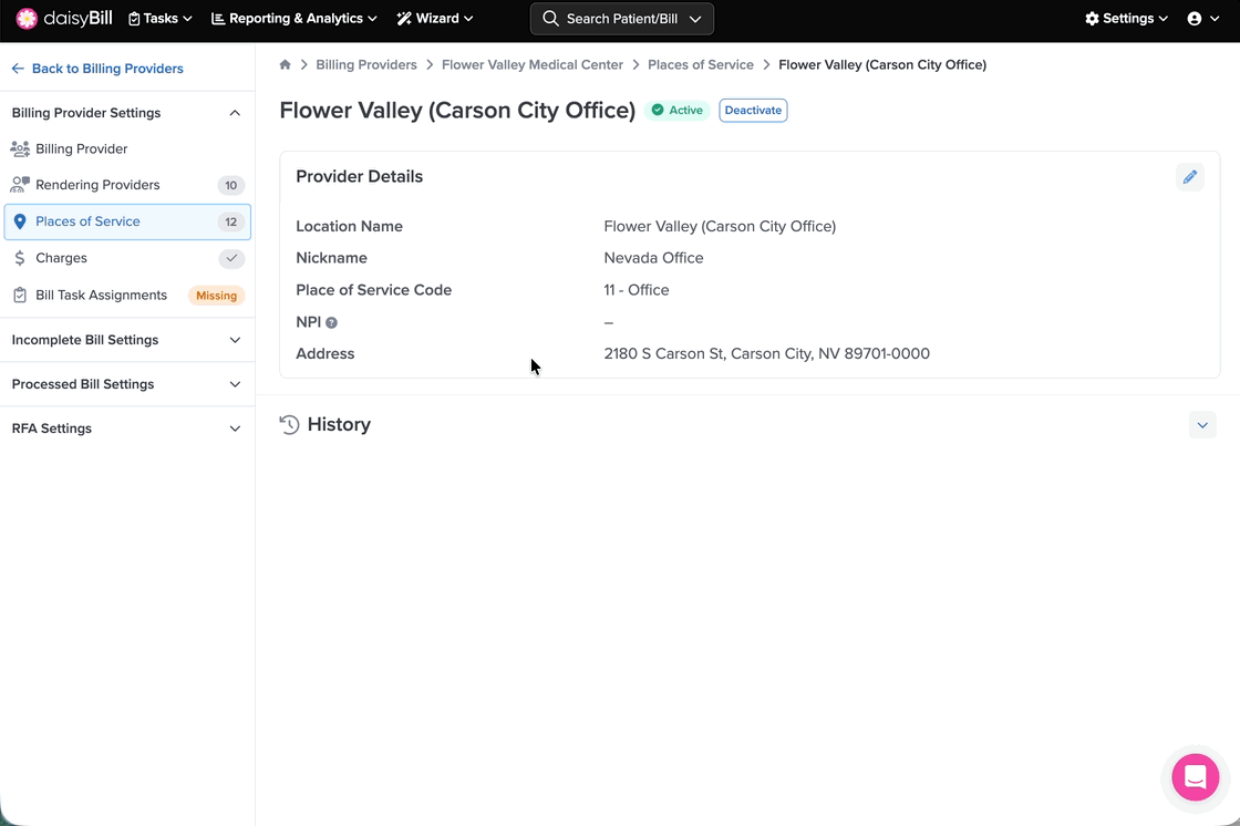 When adding a new Place of Service it is automatically marked as Active. To deactivate a Place of Service and prevent it from being selected on new bills, click ‘Deactivate’