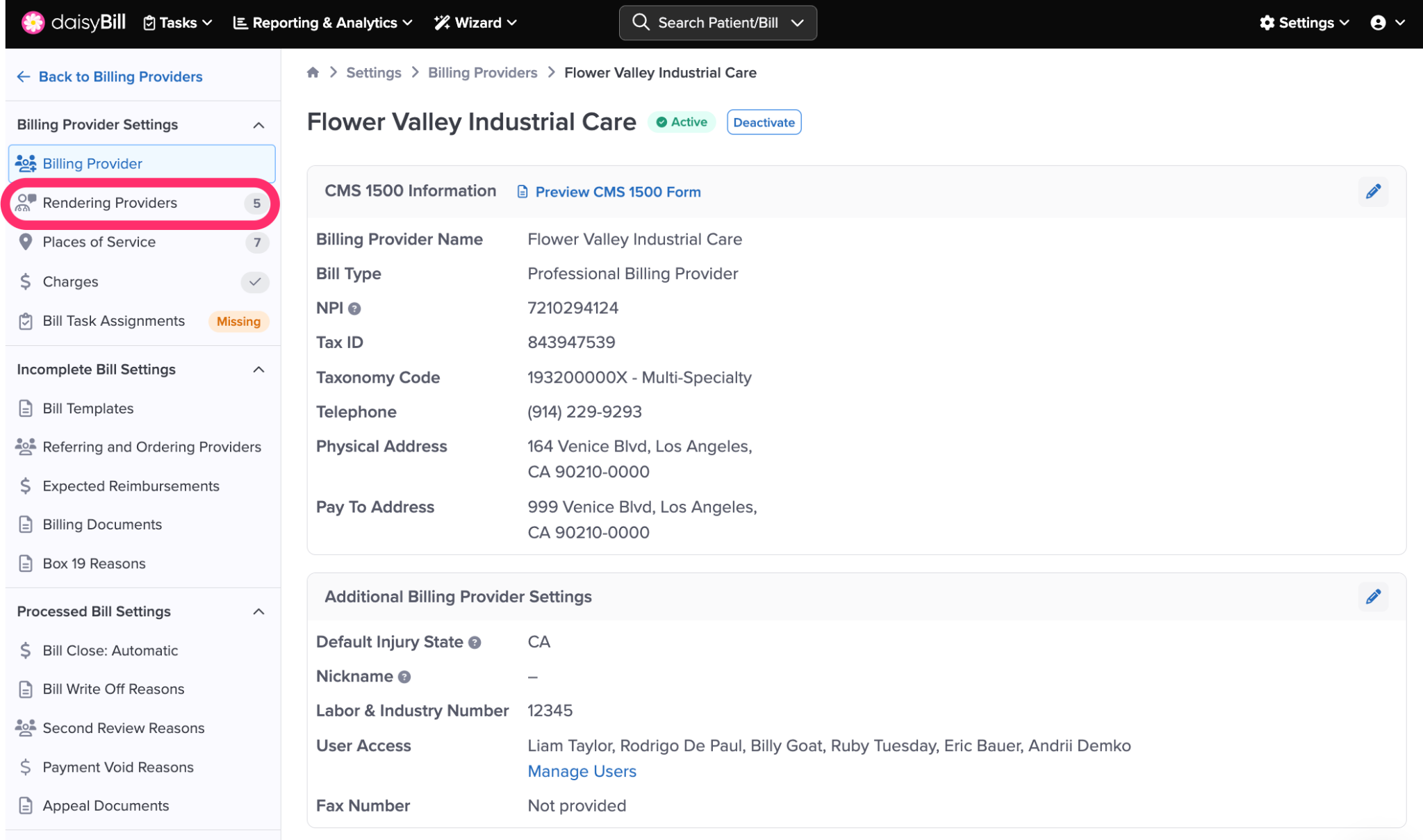 New Rendering Providers are automatically set as ‘Active’. Only Active Rendering Providers can submit bills. To deactivate a Rendering Provider and stop it from appearing on new bills, click ‘Deactivate’.