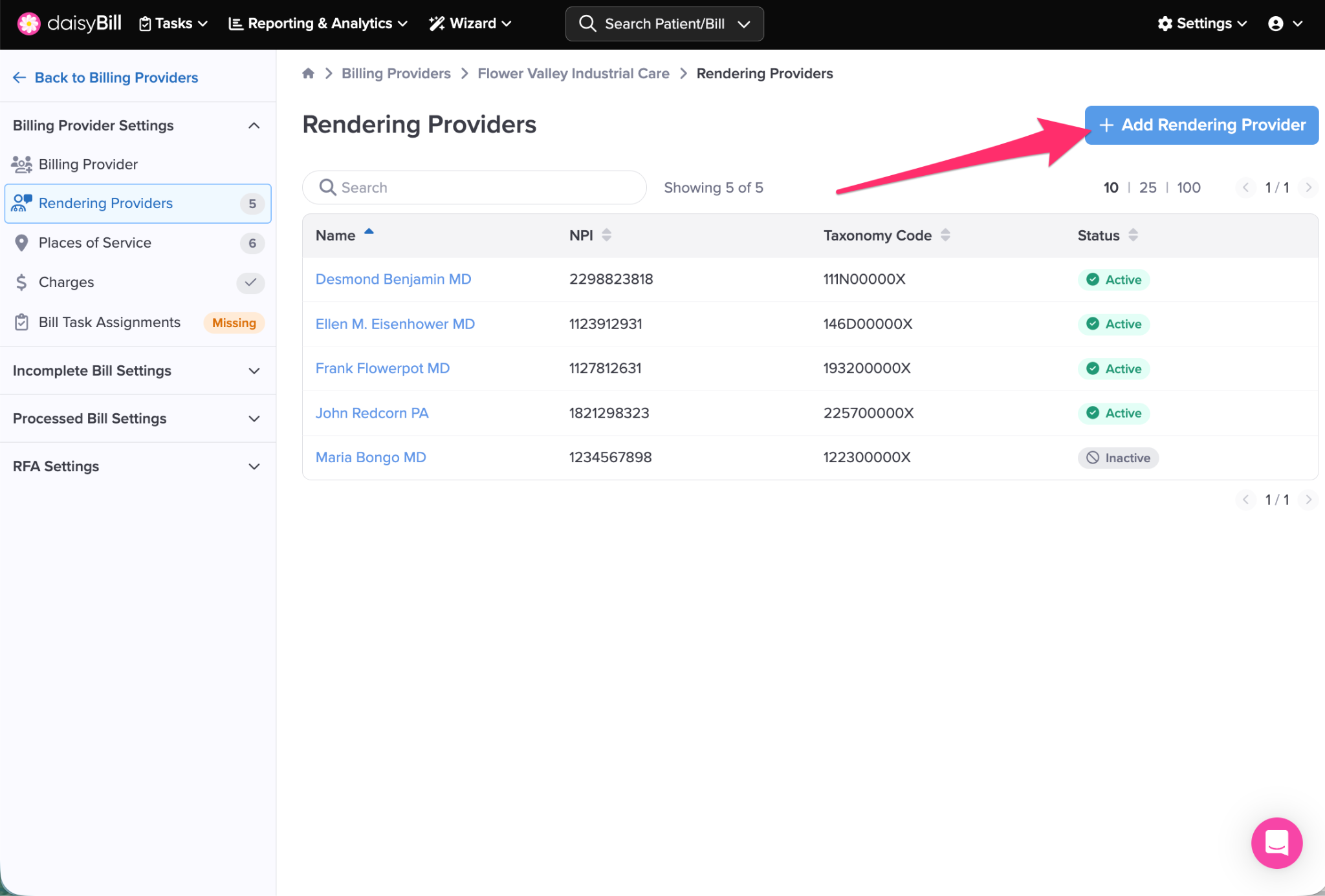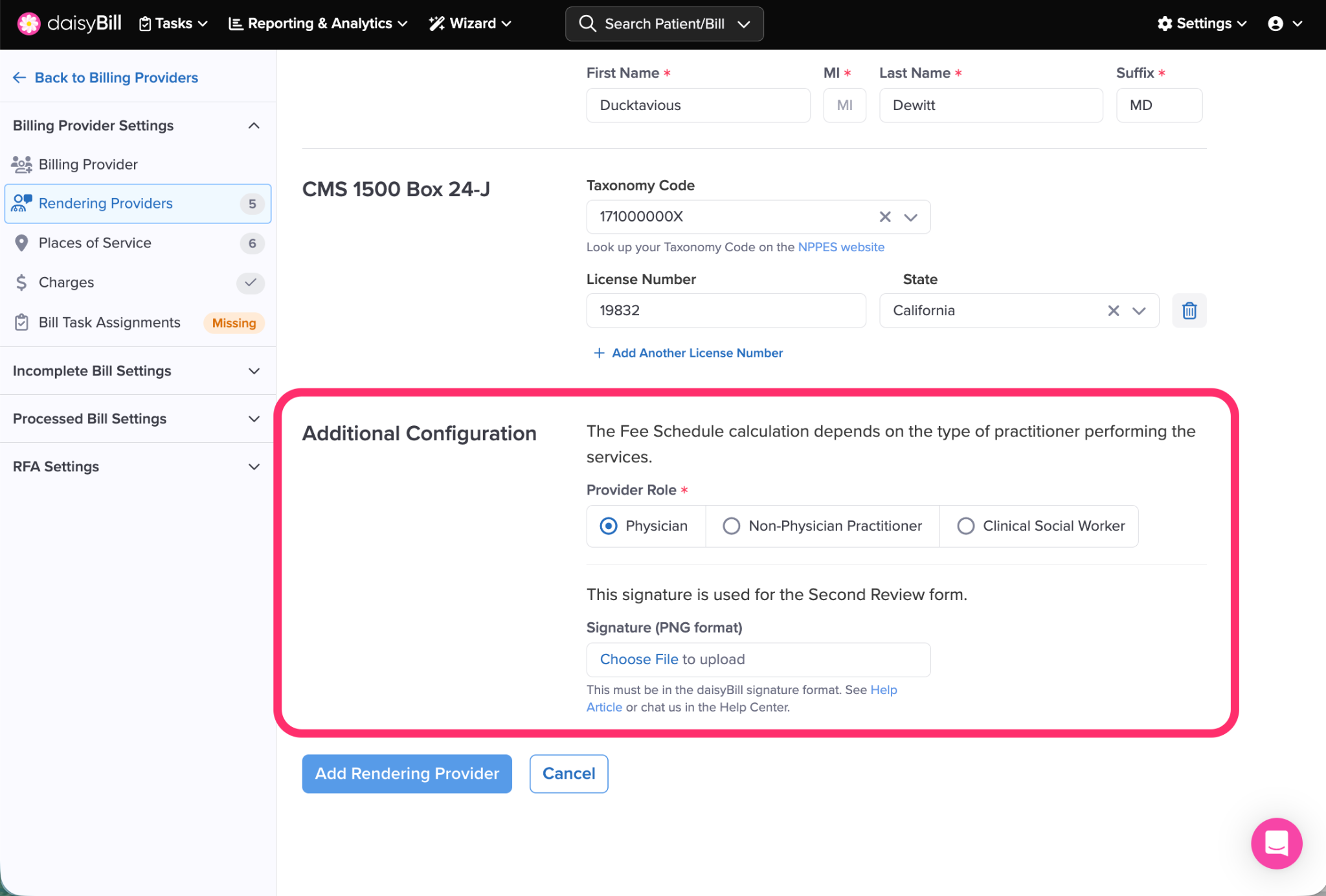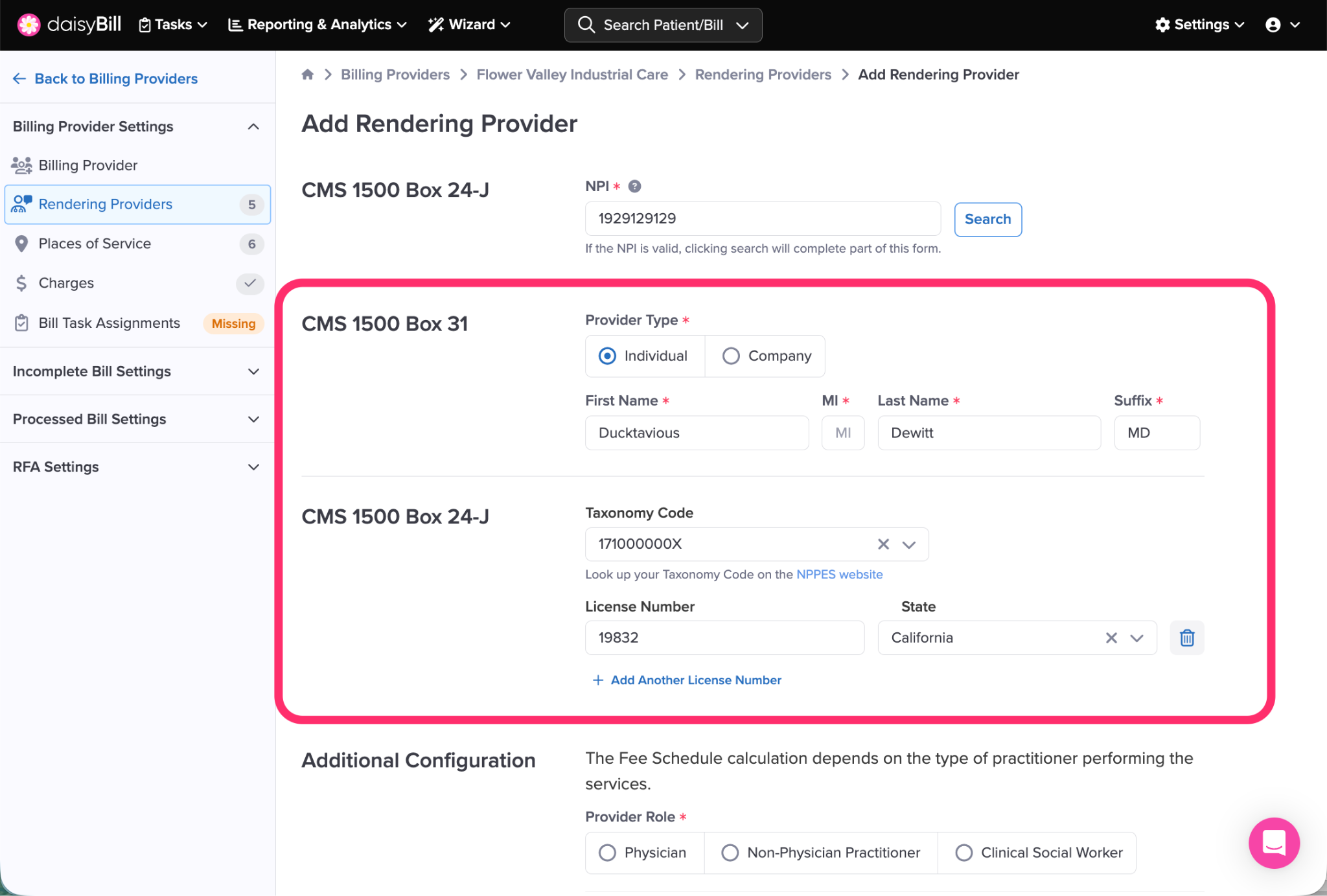 daisyBill makes it easy to view and add required information for each Rendering Provider associated with a Billing Provider.