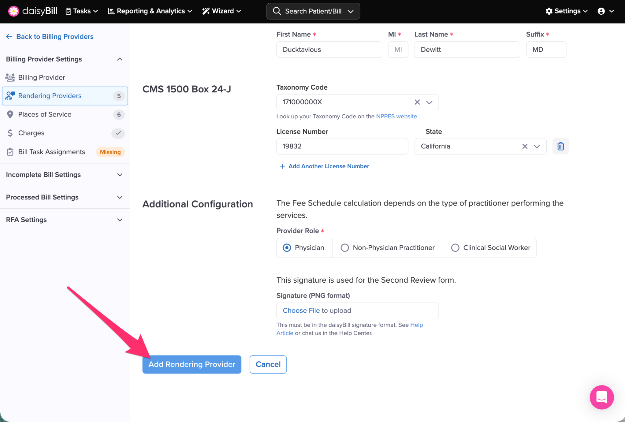 Click here for detailed instructions on how to add a ‘Signature’ to an existing Rendering Provider: Add Rendering Provider Signature.