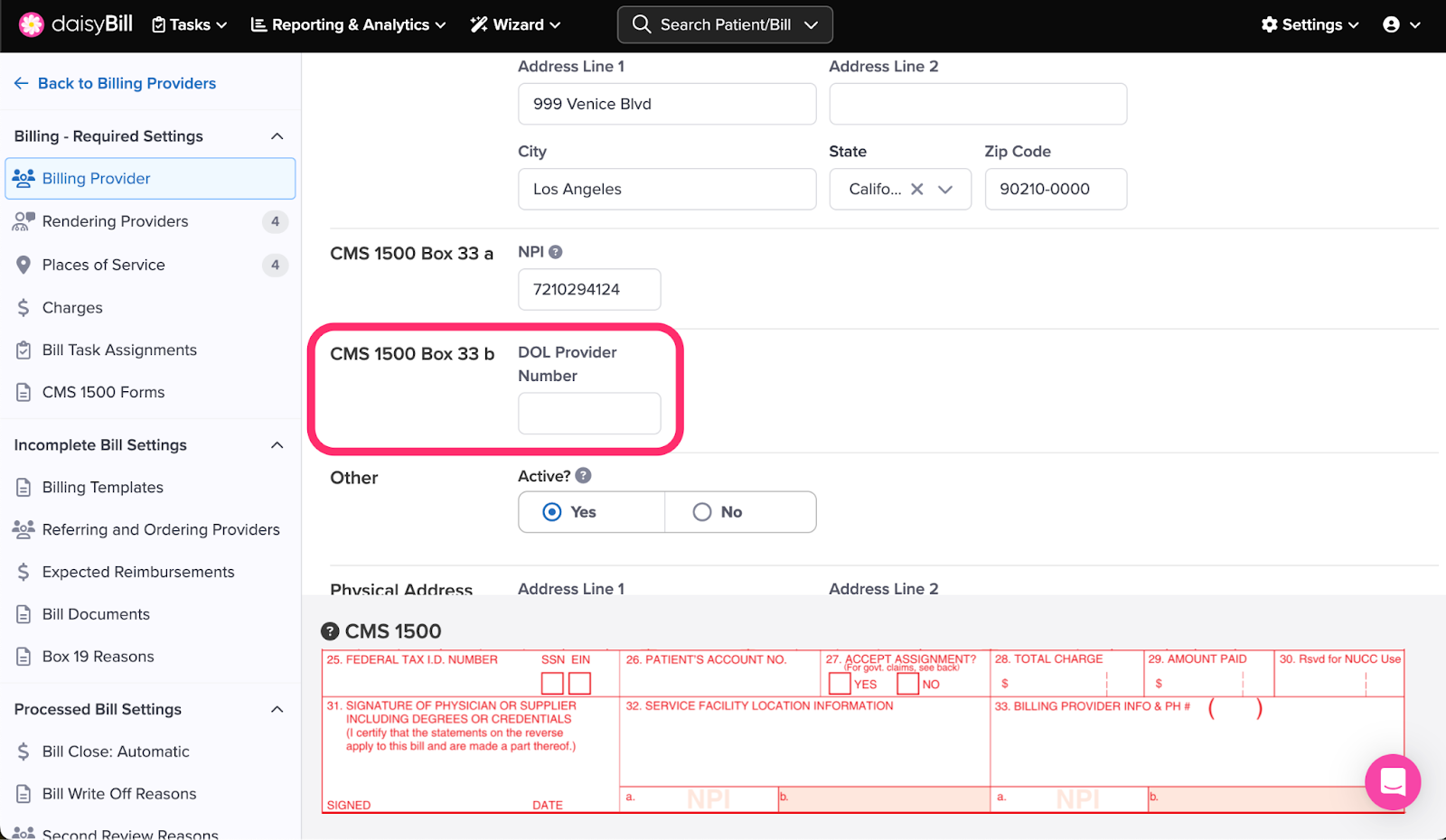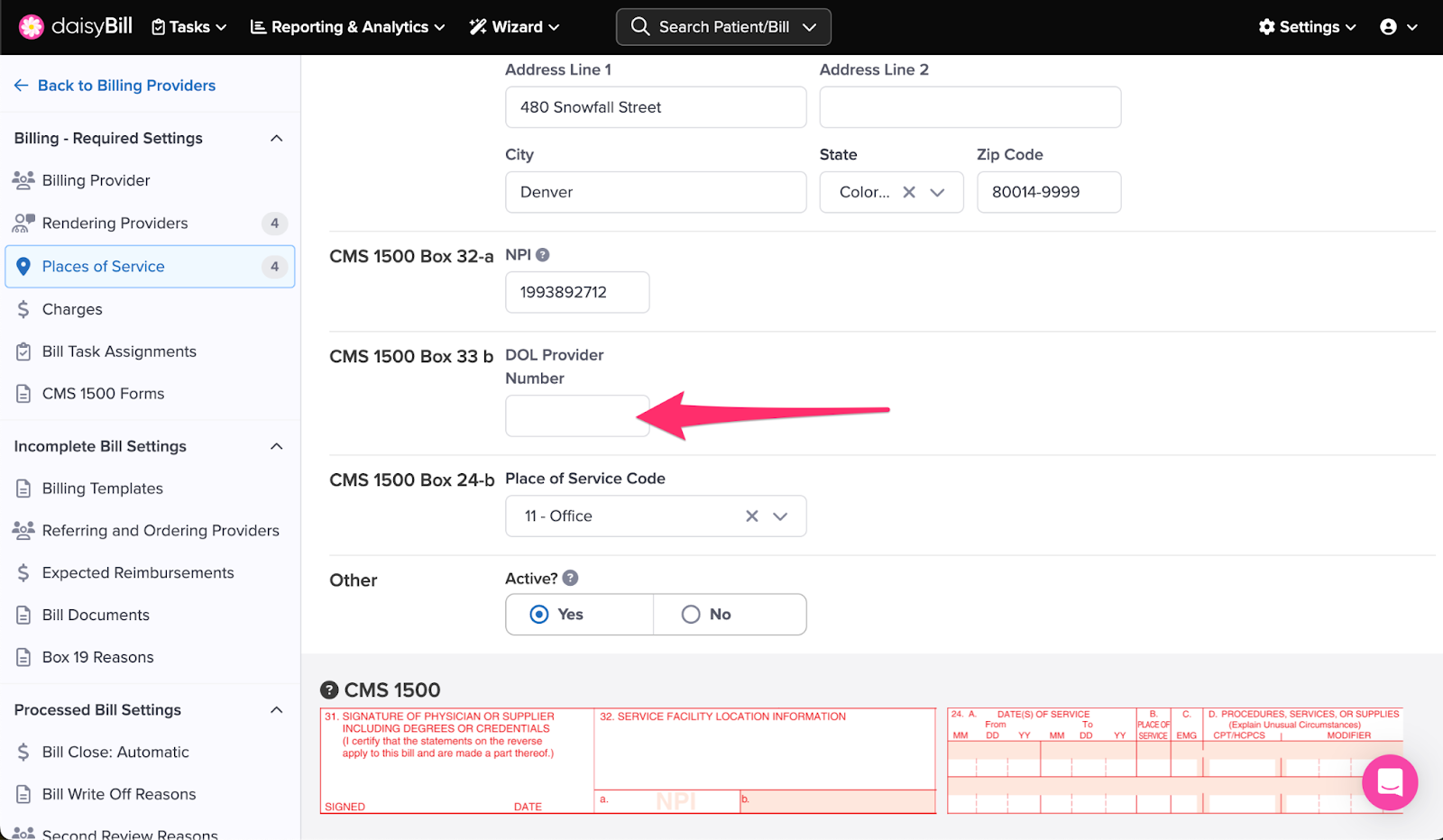 If your Billing Provider has multiple DOL Provider Numbers by Place of Service or Rendering Provider chat the Help Center to have your Billing Provider settings updated.