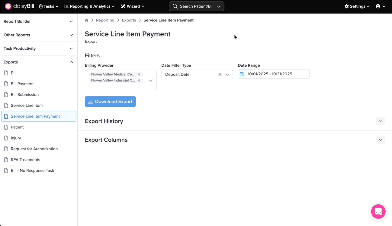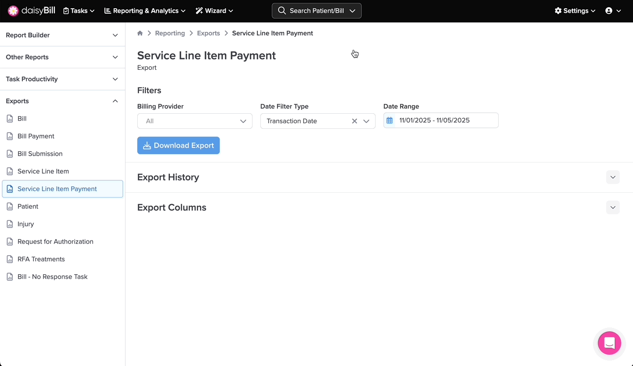 The Service Line Item Payment Export lets you study detailed Service Line Item (Procedure Code) level payment and allowance information away from daisyBill.