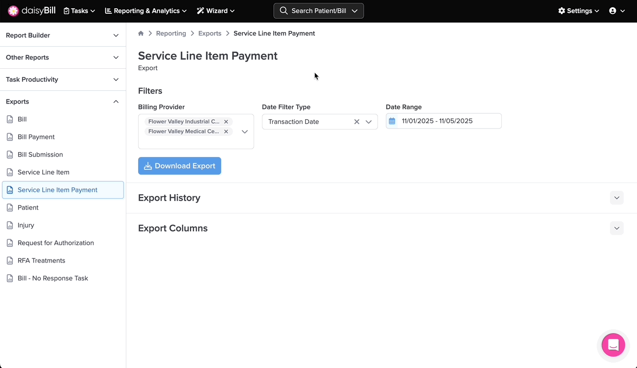 Step 8. To view previous Service Line Item Payment Exports, click ‘Export History’