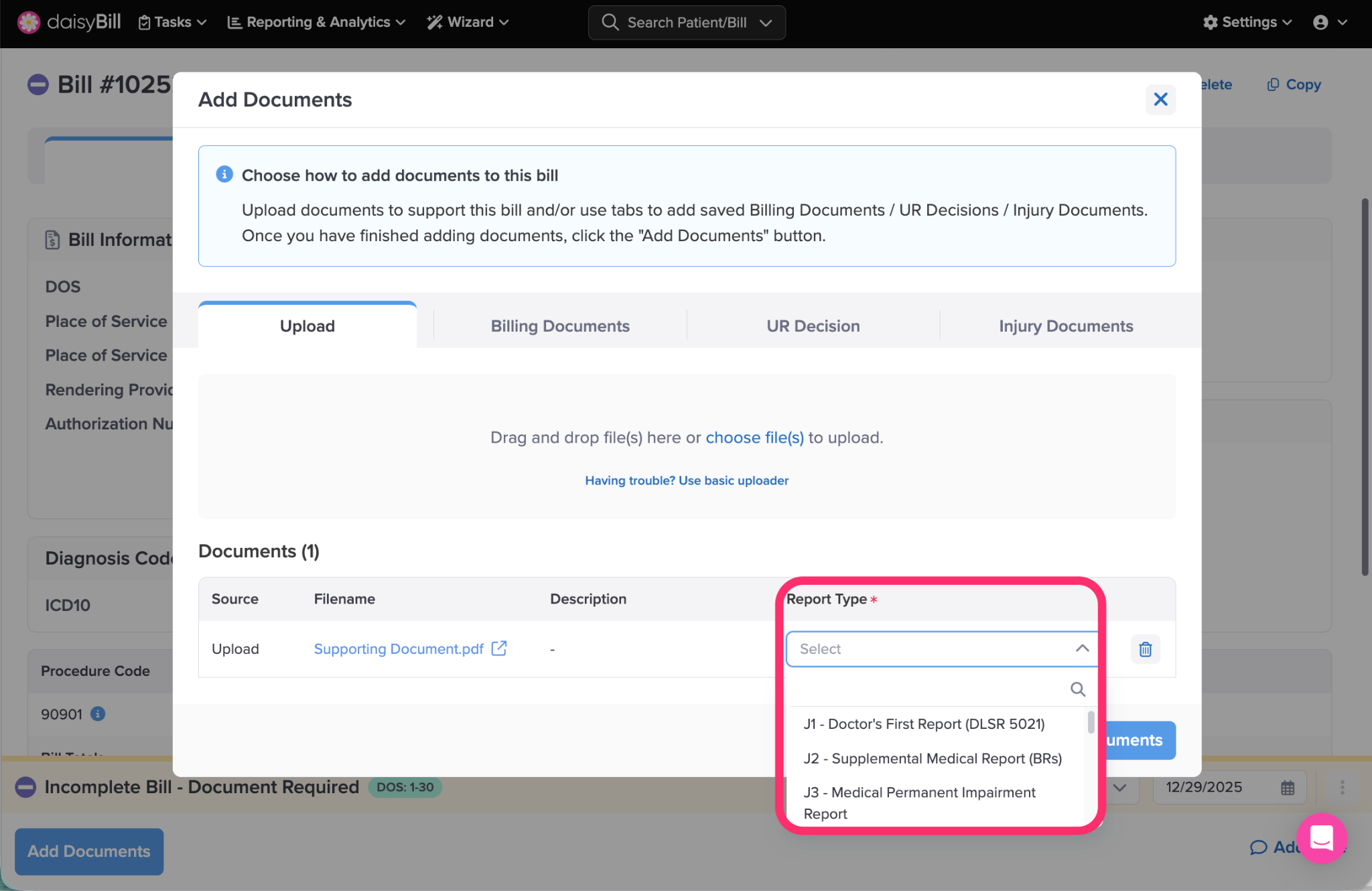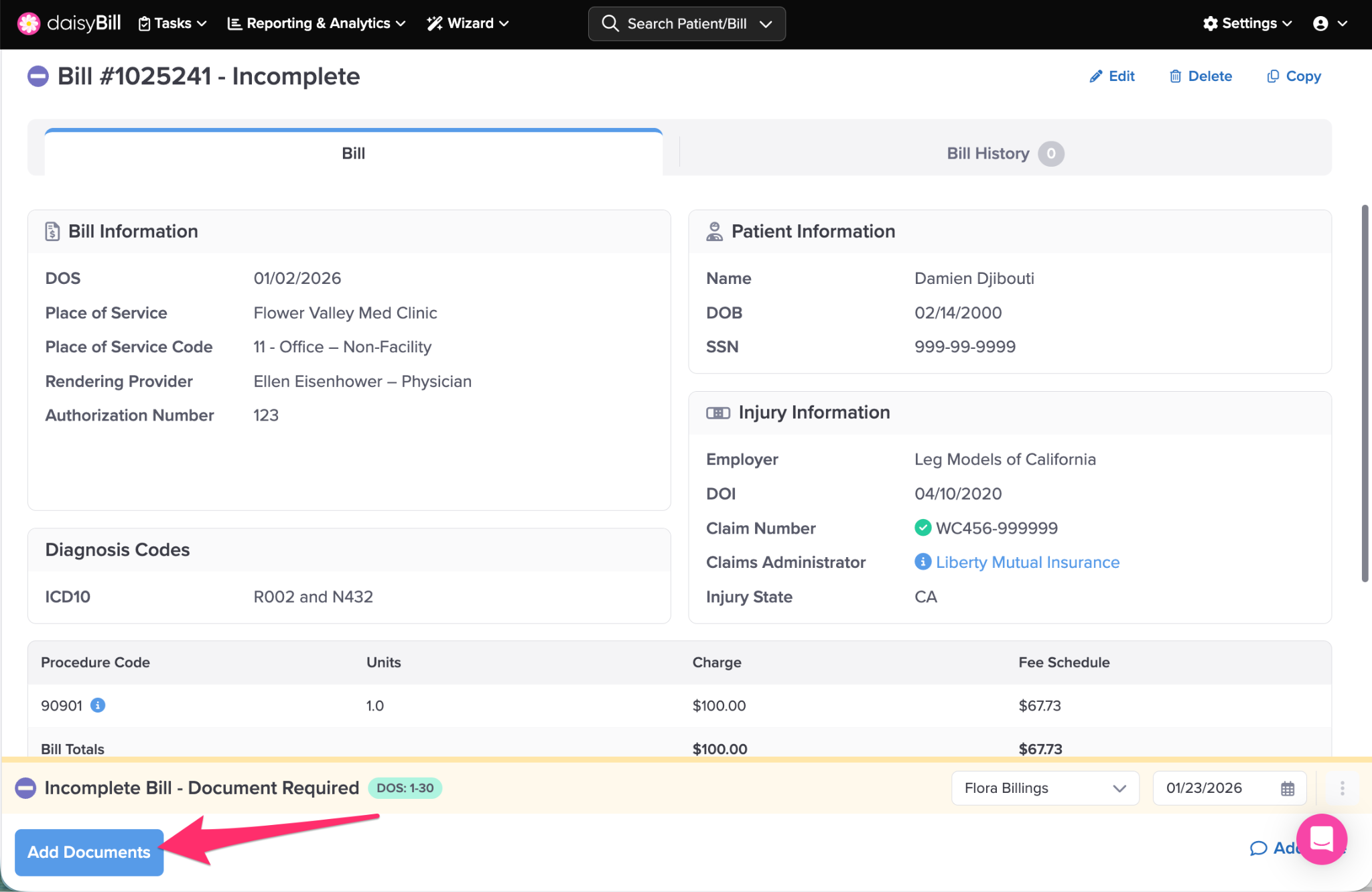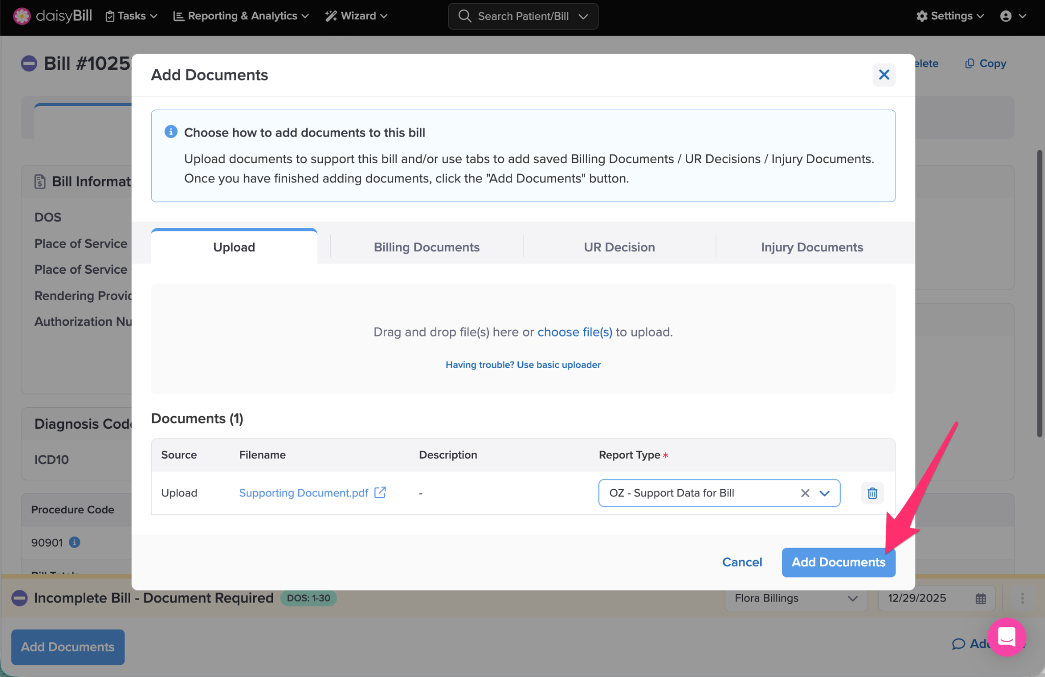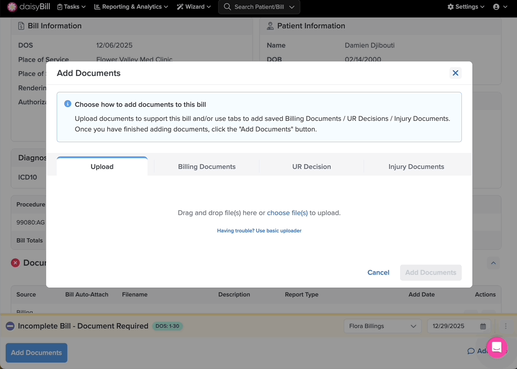Once Create Bill is clicked, daisyBill checks for errors. If daisyBill detects a missing Document, daisyBill assigns a Document Required task. A Bill with a Document Required task is in Incomplete status and cannot be submitted until the task is resolved.