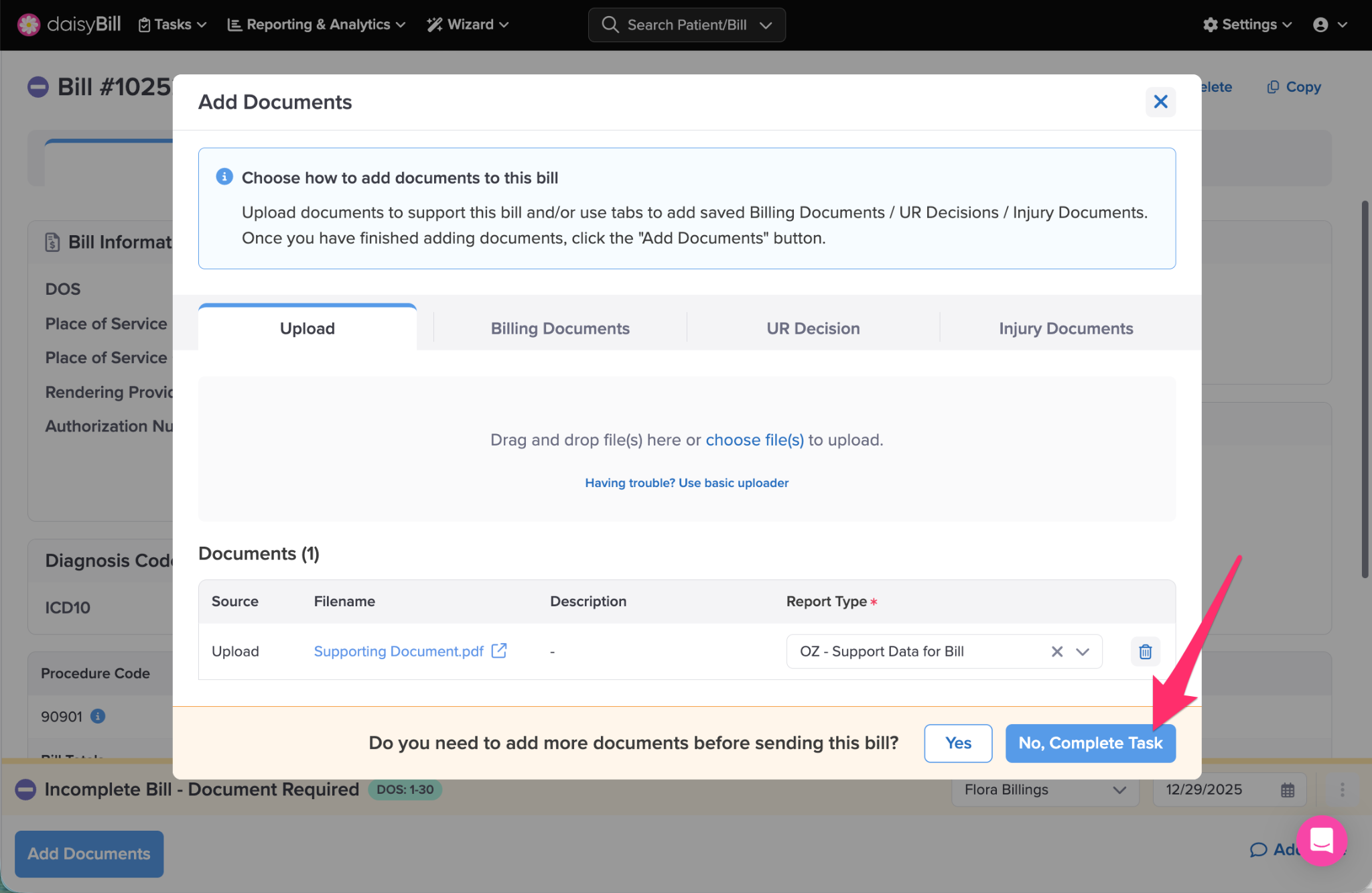 If you are finished adding all documents to the bill and want to complete the Document Required task, click ‘No, Complete Task’