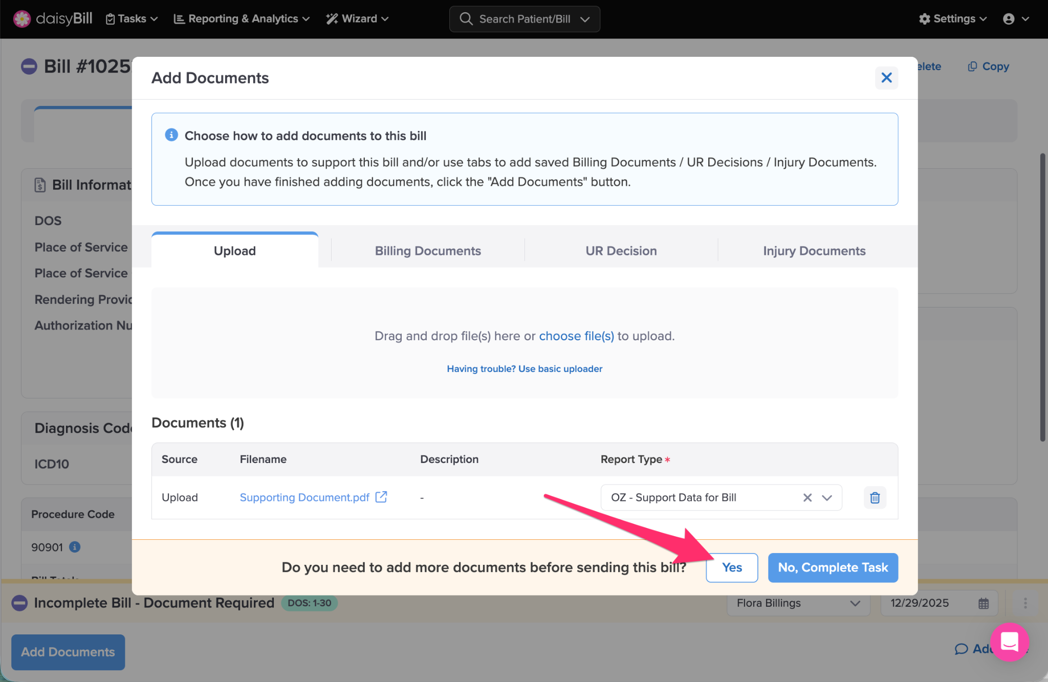 If you have more documents that you need to add to the bill and you wish to keep the Document Required task assigned, click ‘Yes’