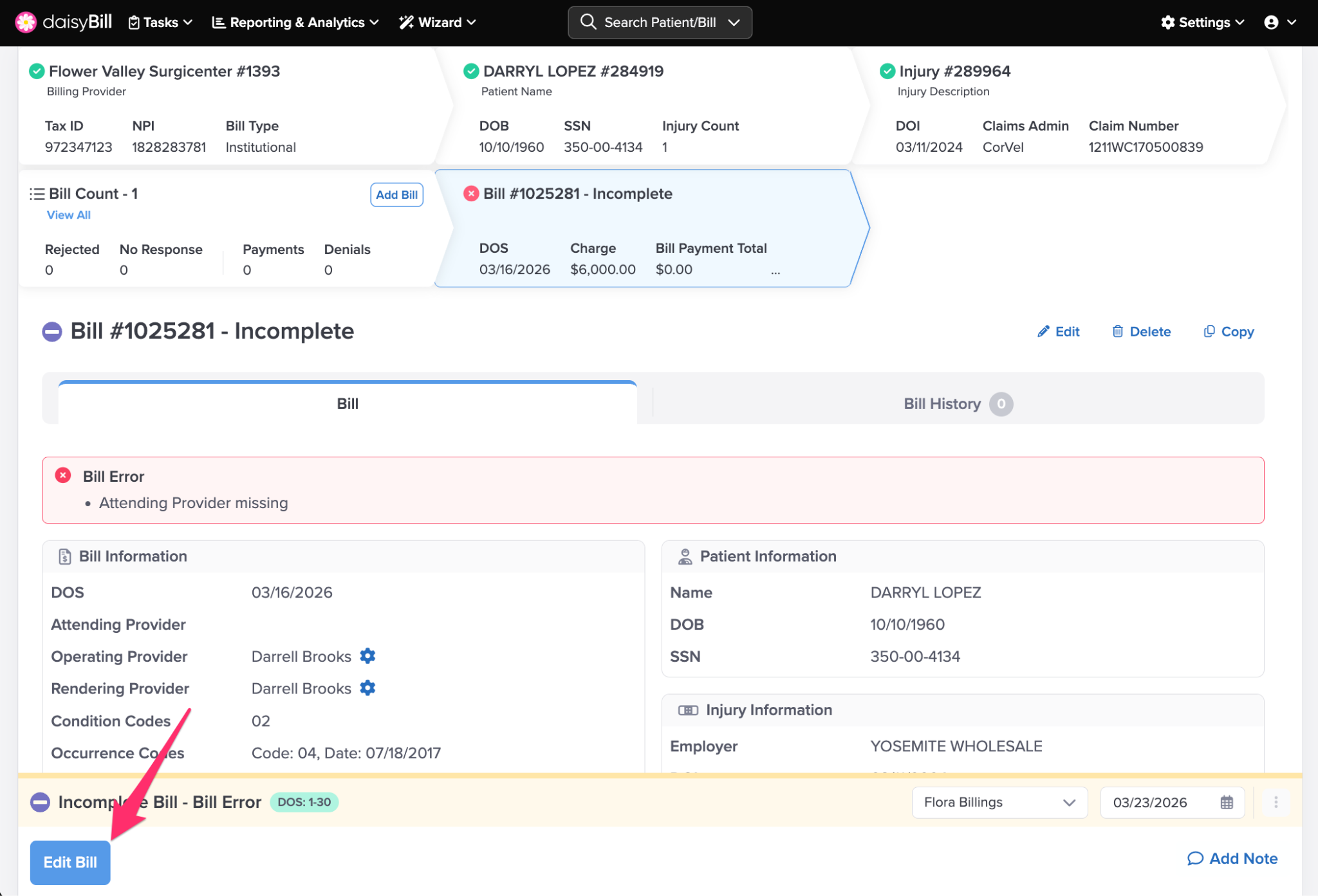 daisyBill scrubs all bills assigned an Incomplete Status for errors that could prevent payment.