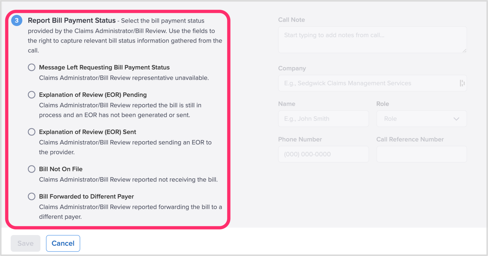 Each option prompts you to report key information from your call with the claims administrator.