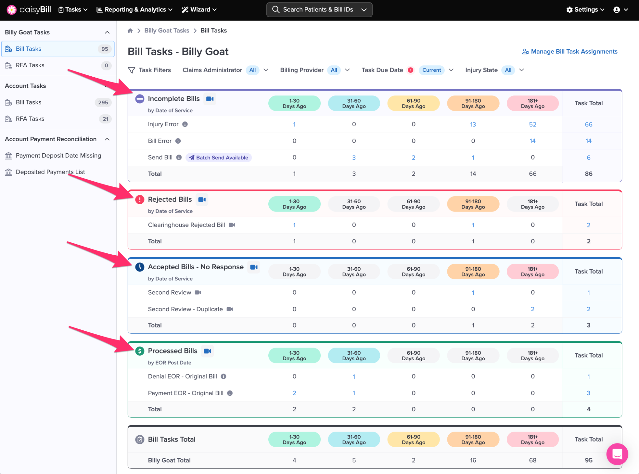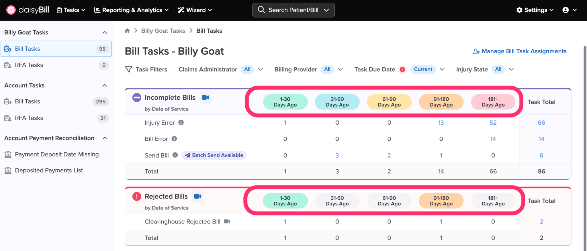 daisyBill groups Bill Tasks by the bills' Dates of Service, except for Processed bills.