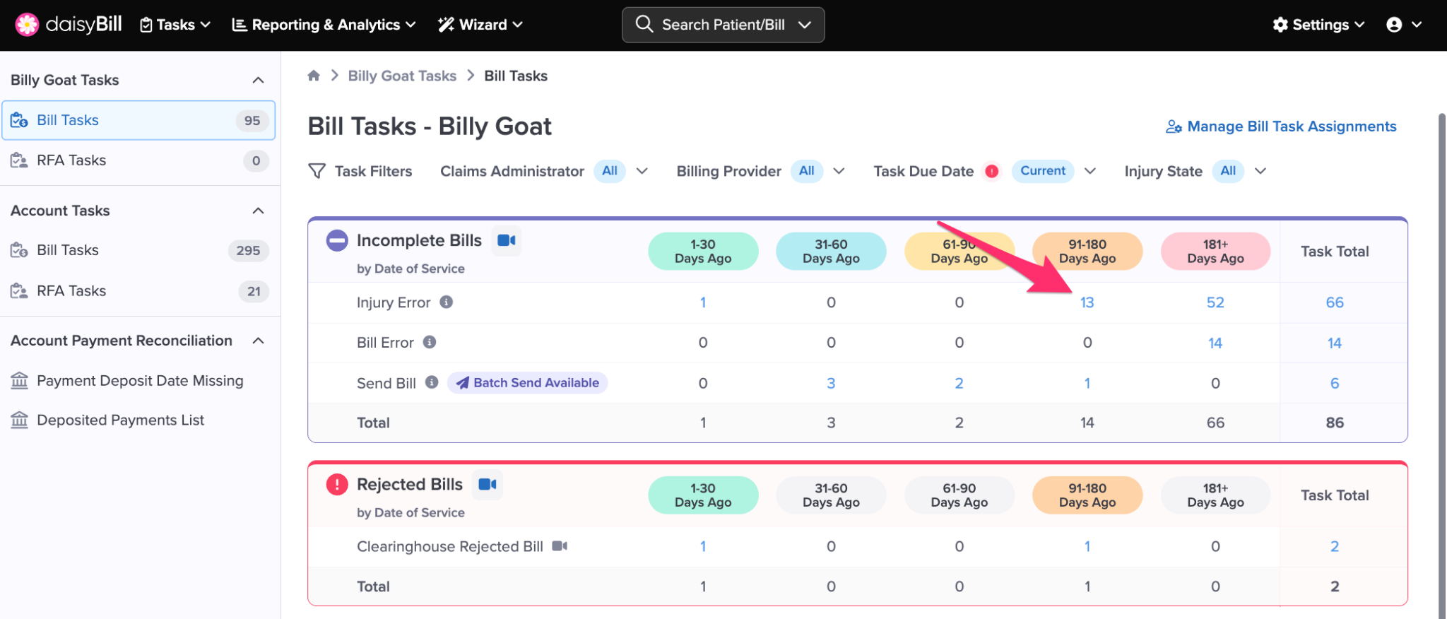 Under each Bill Status, your Bill Tasks Page lists the Tasks you need to complete and the total count of bills with each Task.