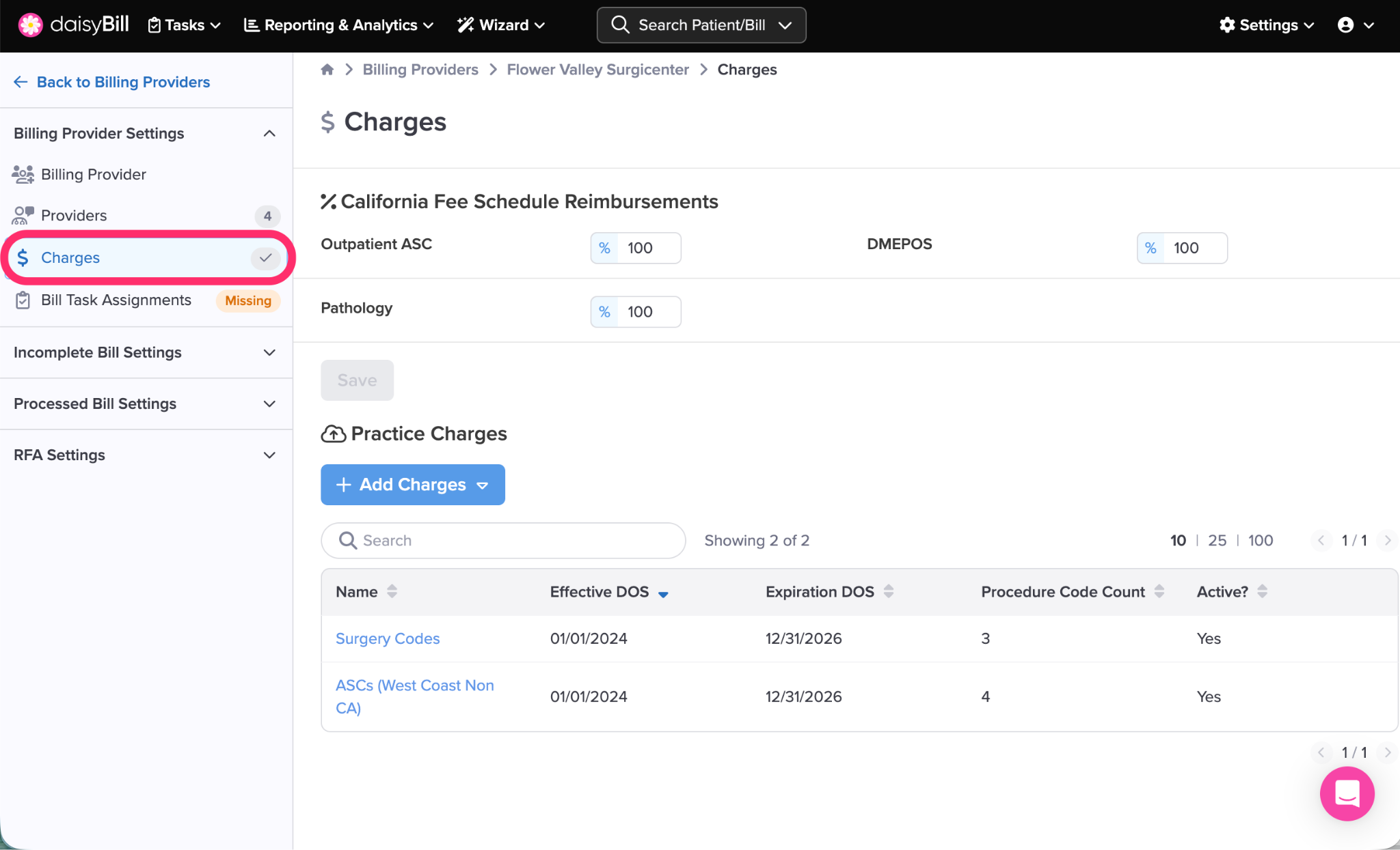 In Charges, set the percentage of the state fee schedule (if available), or create your own Charges for all or some of the services you bill.